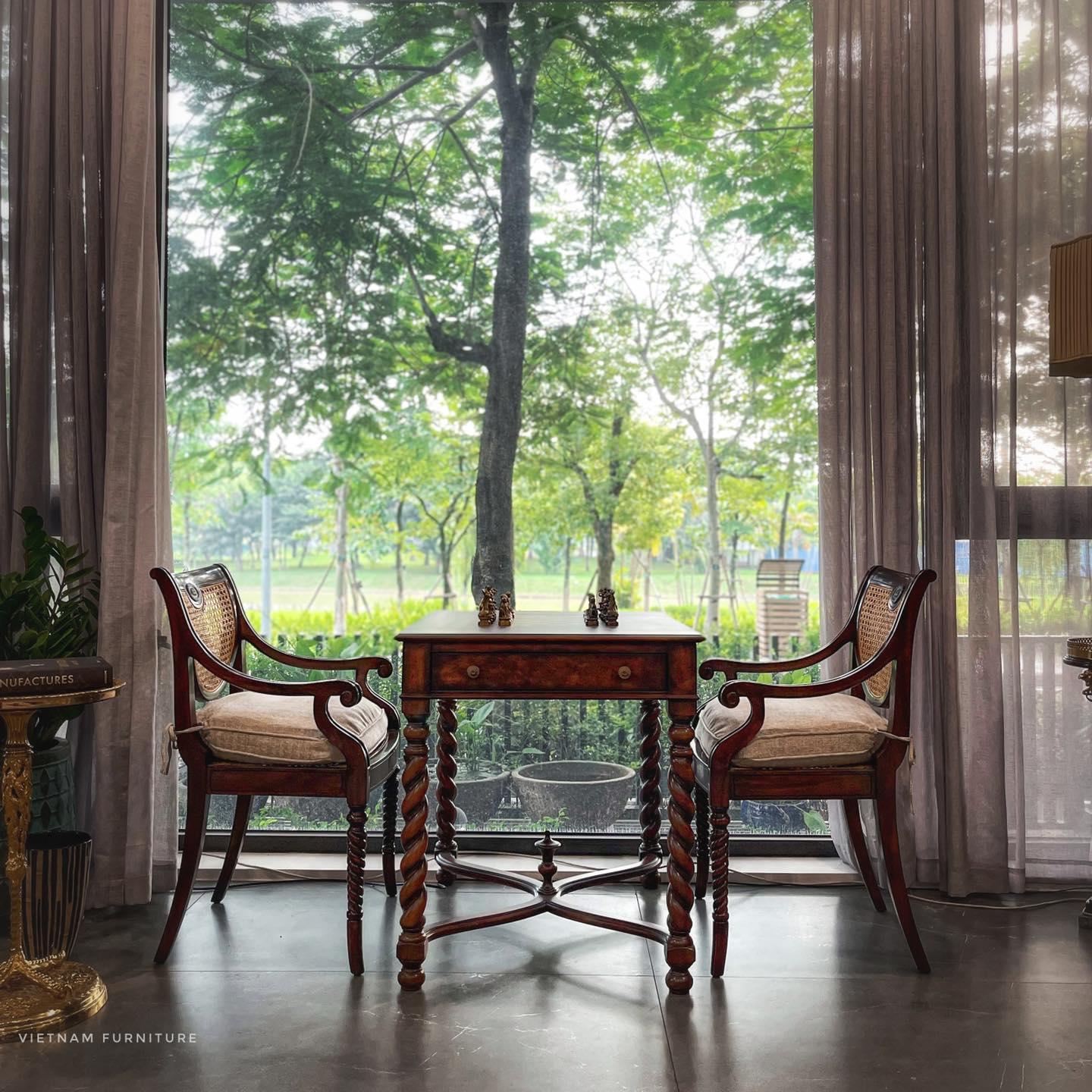 Hoàn thiện: Gỗ mahogany, veneer vân hoa, mặt chạm tay, sơn gốc nước.