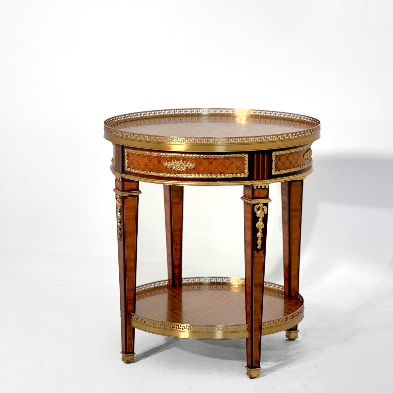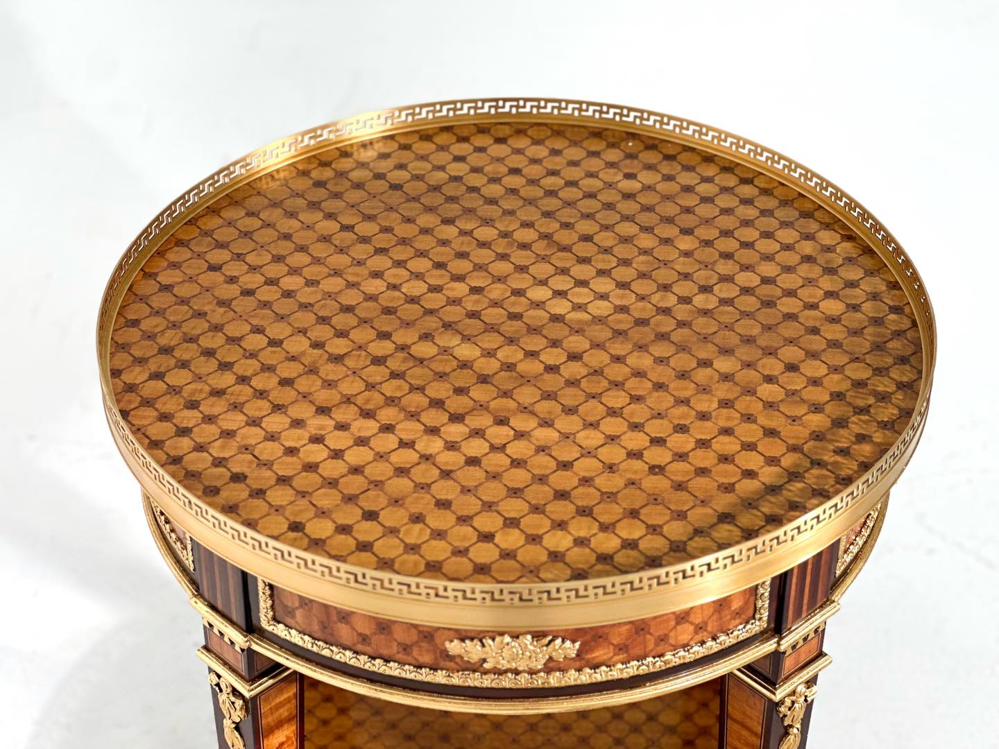 Họa tiết Meander chạy viền đồng bao quanh, mặt bàn sử dụng họa tiết "Greek Key" – biểu tượng kinh điển của kiến trúc cổ đại, tượng trưng cho sự vô tận và dòng chảy vĩnh cửu.