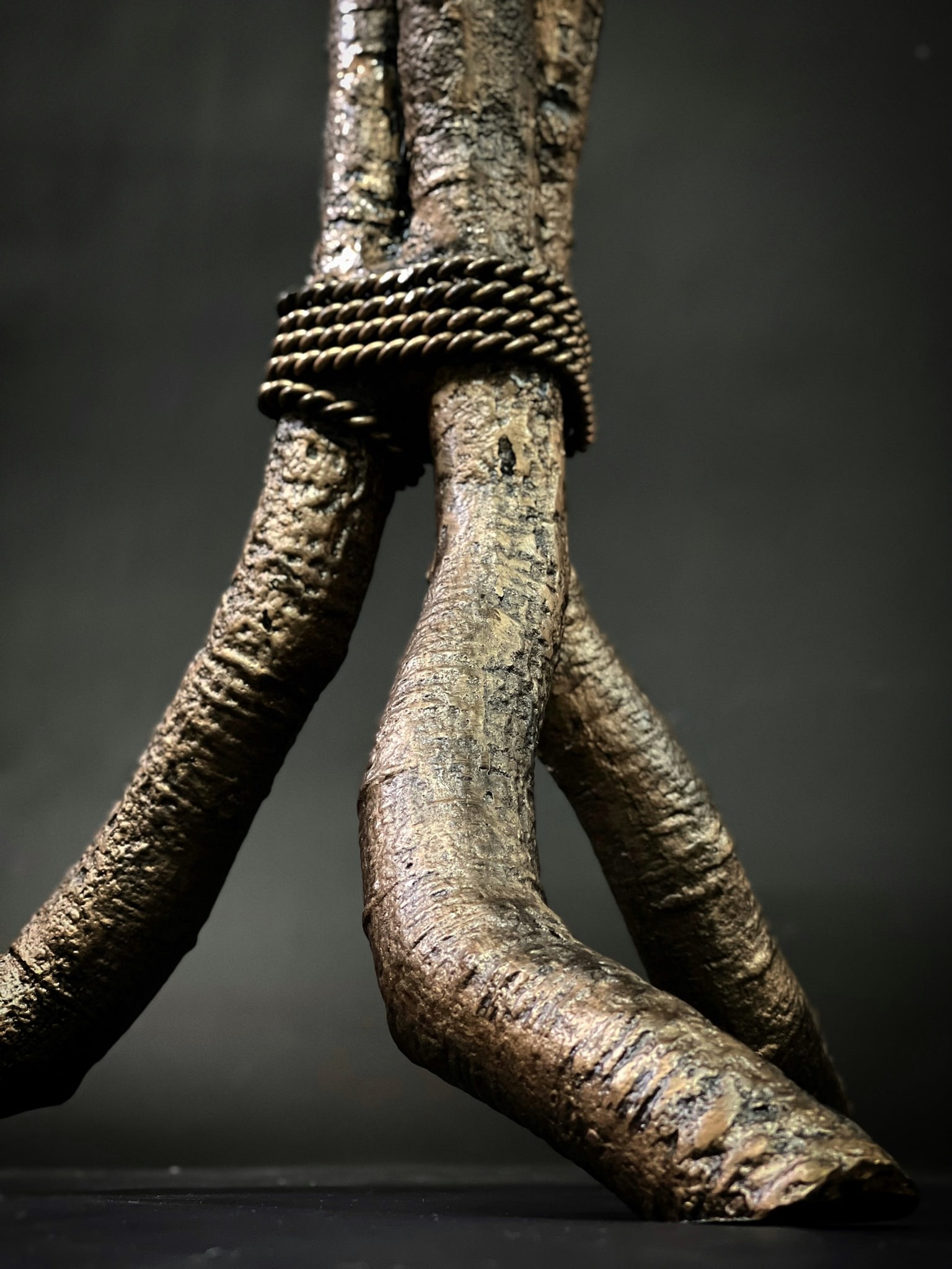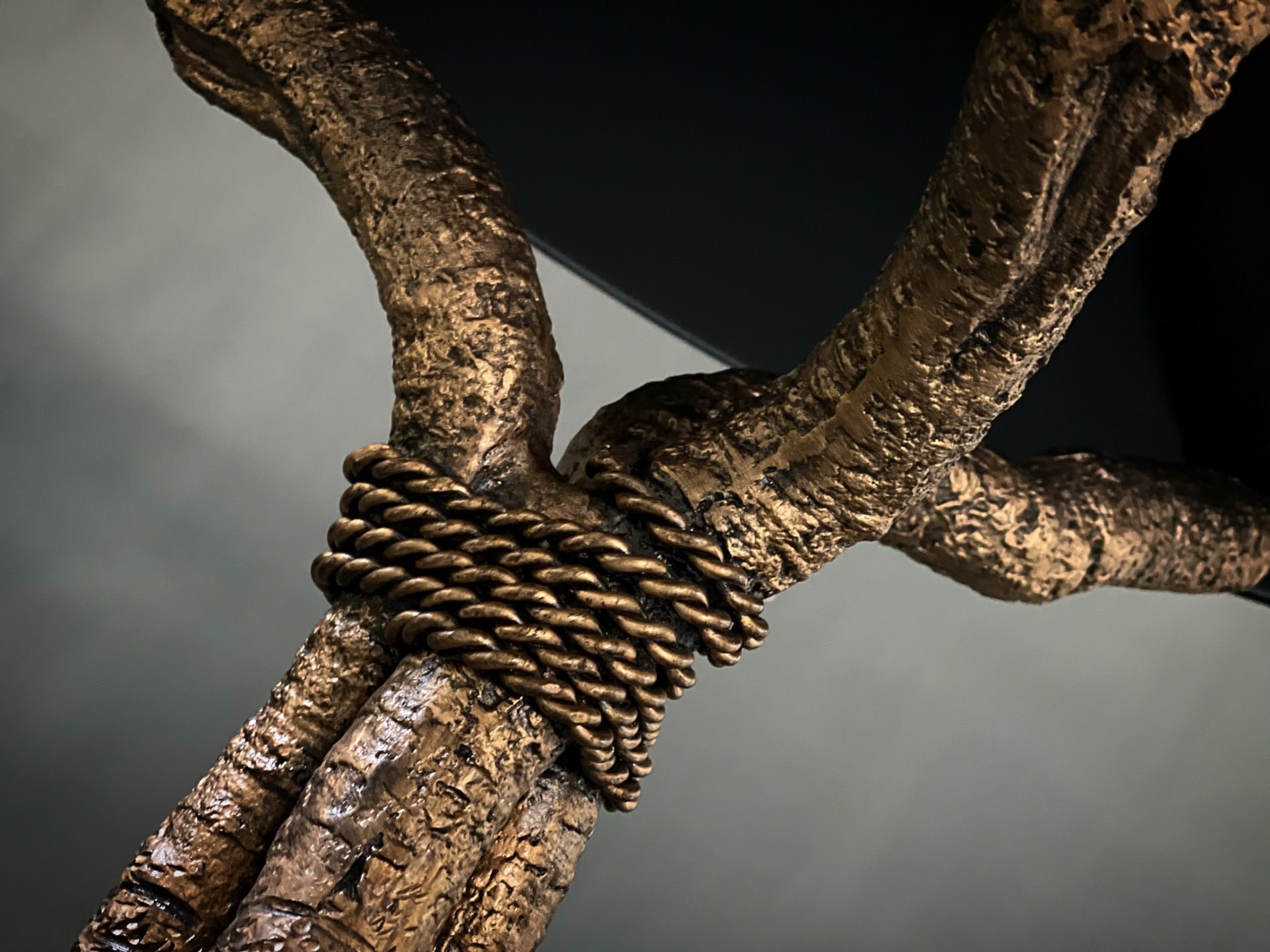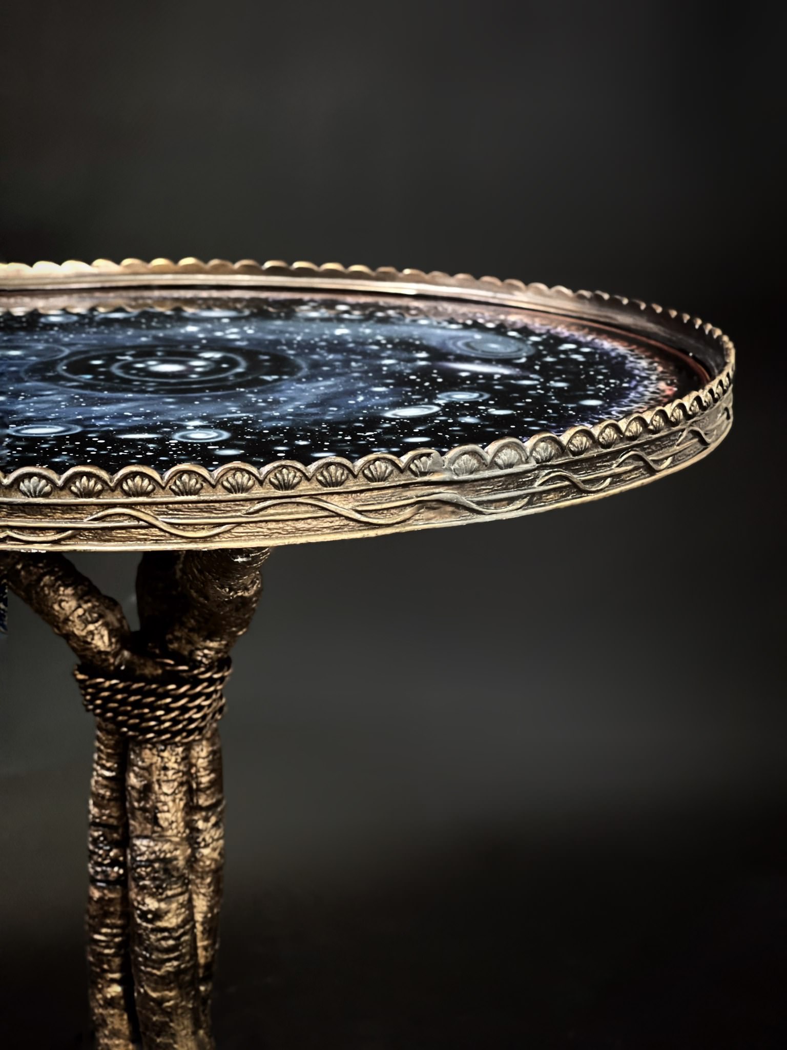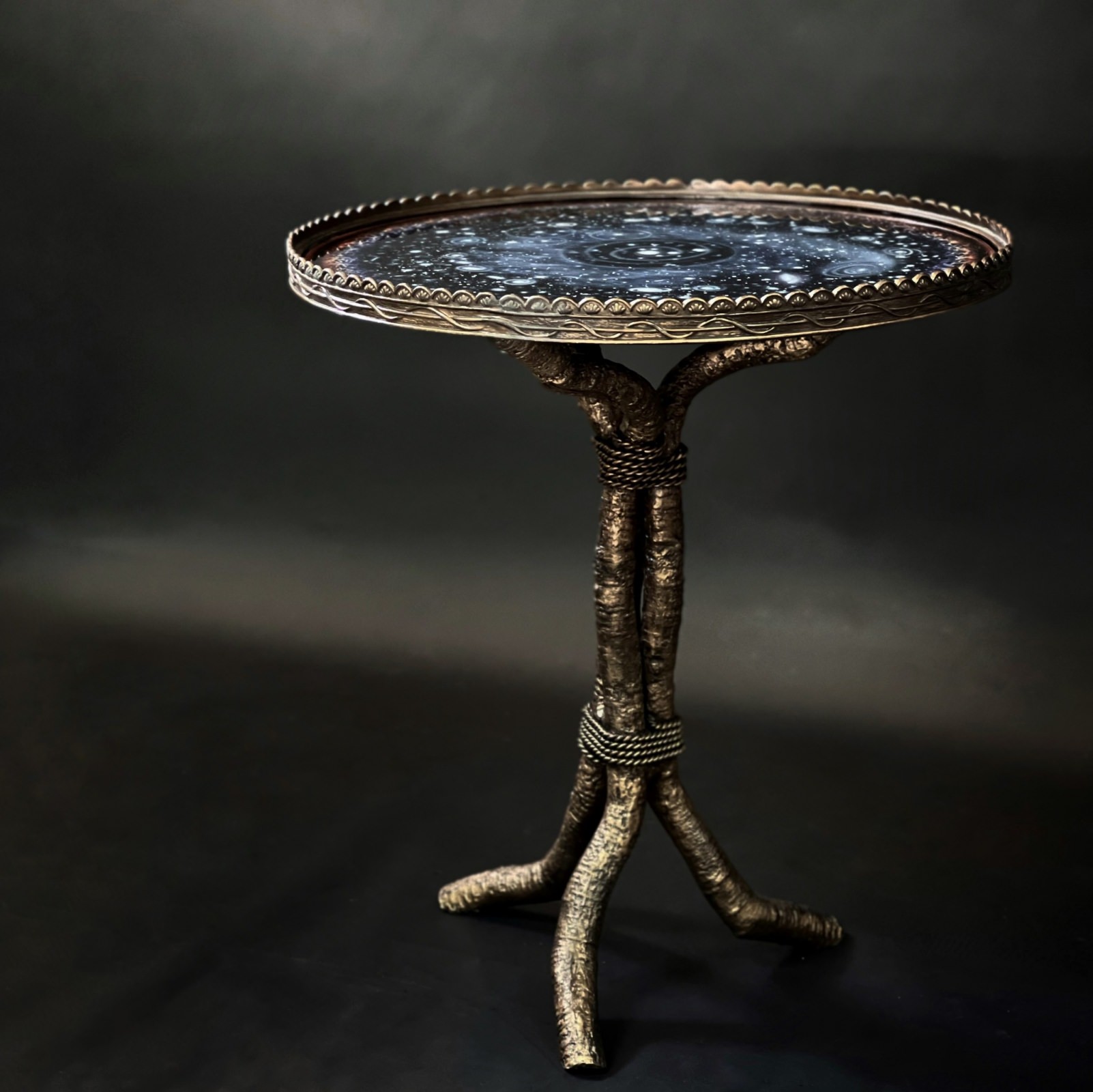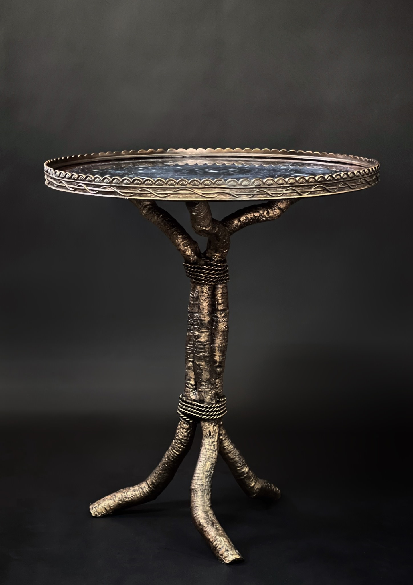 Kích thước: D67cm H67cm Chân kim loại mô phỏng nhành cây màu đồng giả cổ, mặt kiếng vẽ ngược kính.