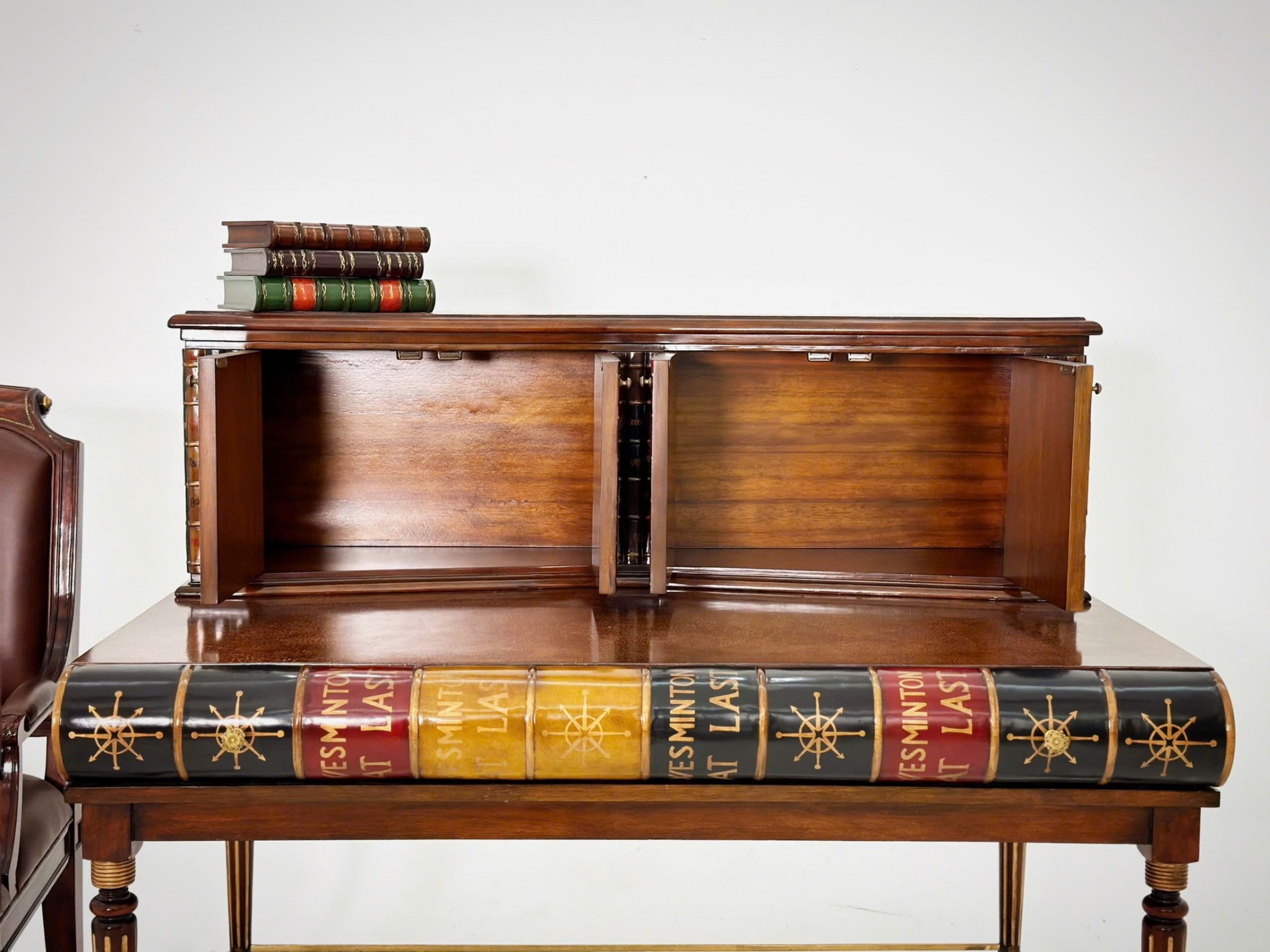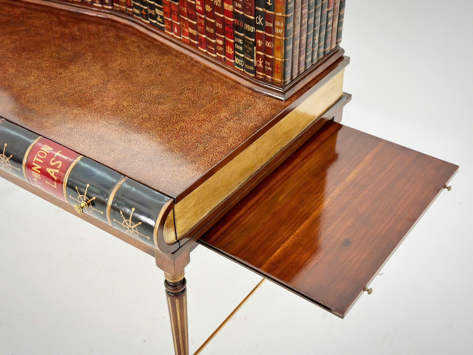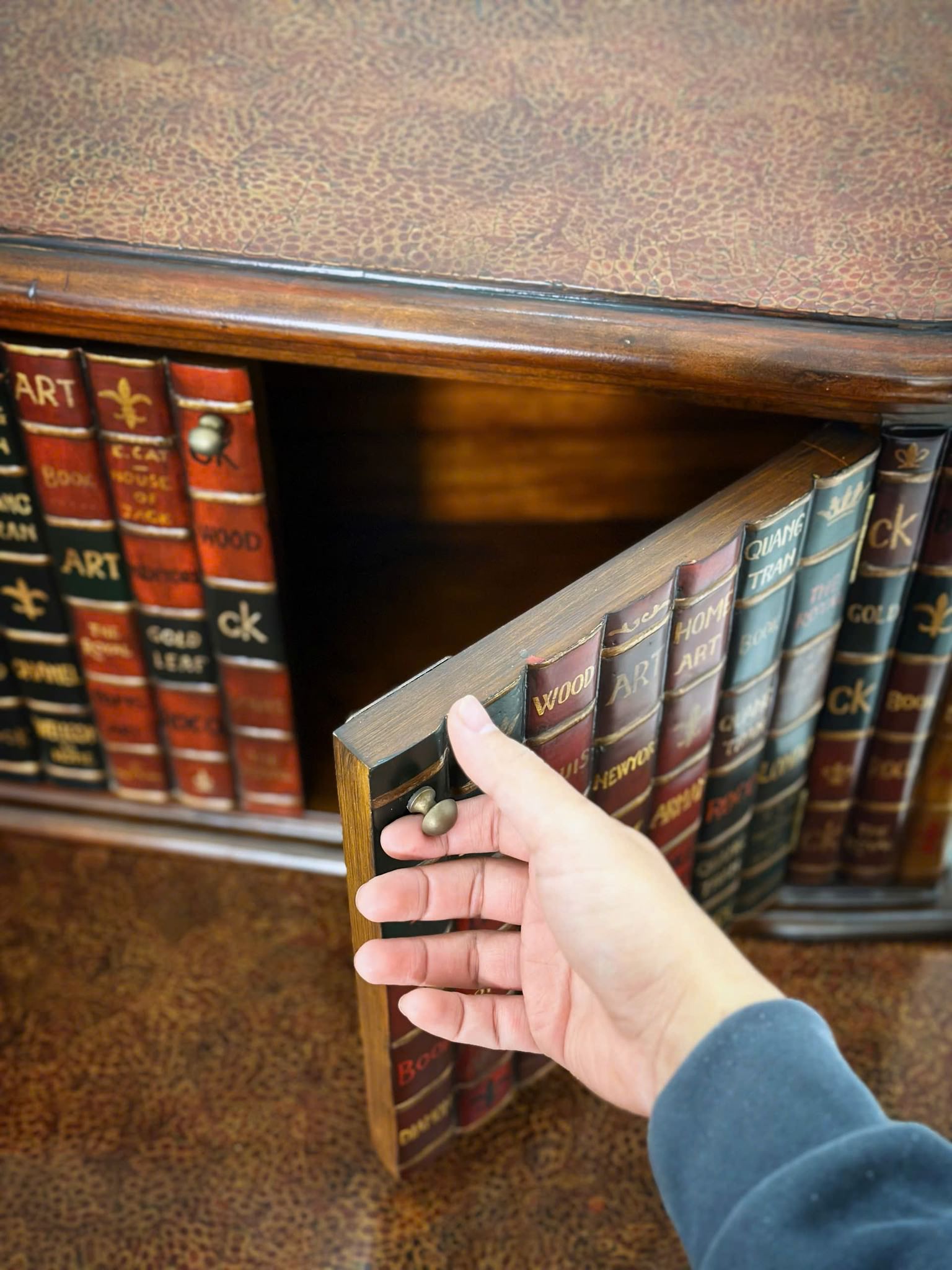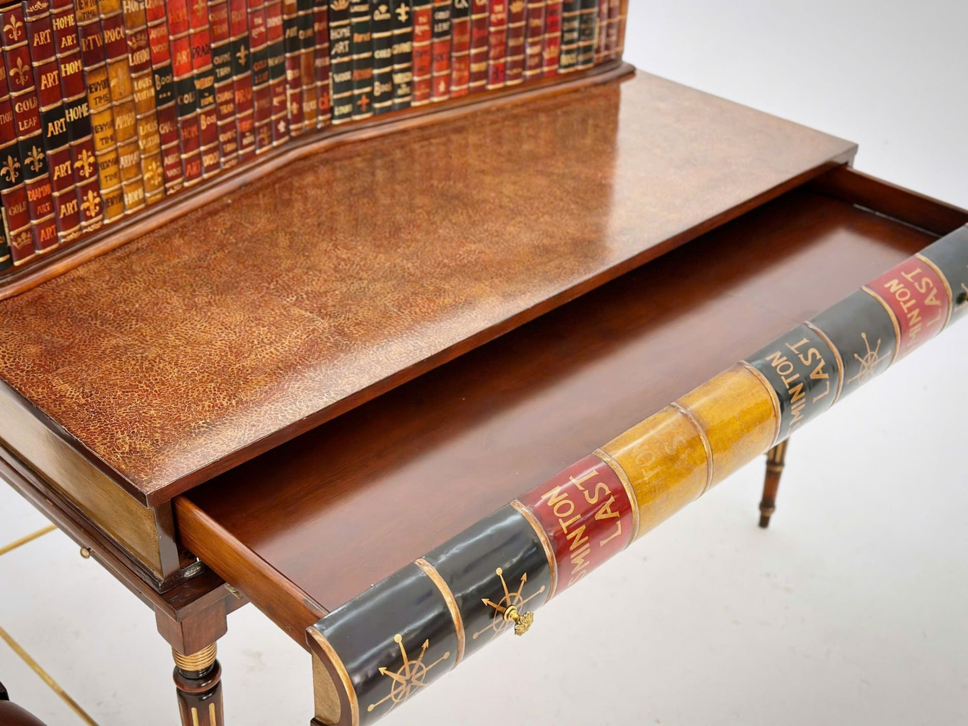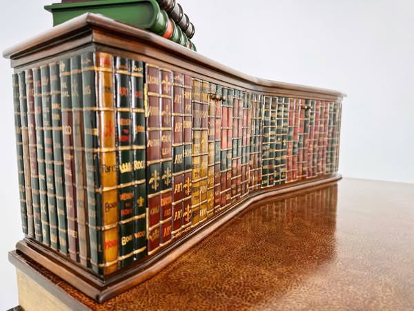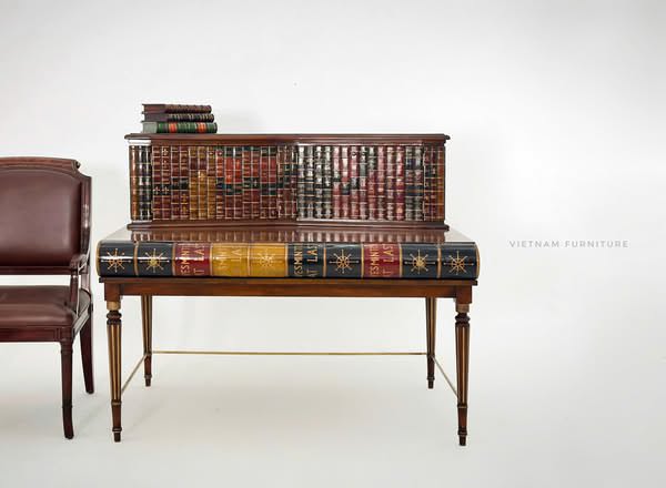 Sự độc đáo này khó mà bắt chước được. Bề ngoài giống quyển sách, phần cánh tủ hộc phía trên cũng làm giả gáy sách. Bàn hoàn thiện từ gỗ Mahogany chạm trổ tinh xảo, mặt bàn sơn mài cẩn trứng.
