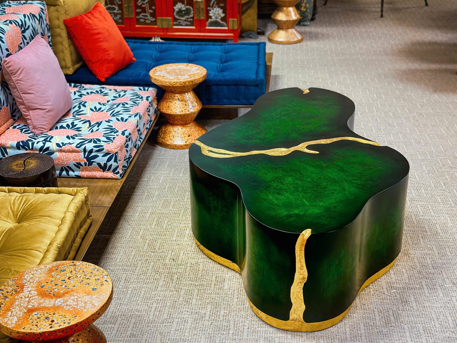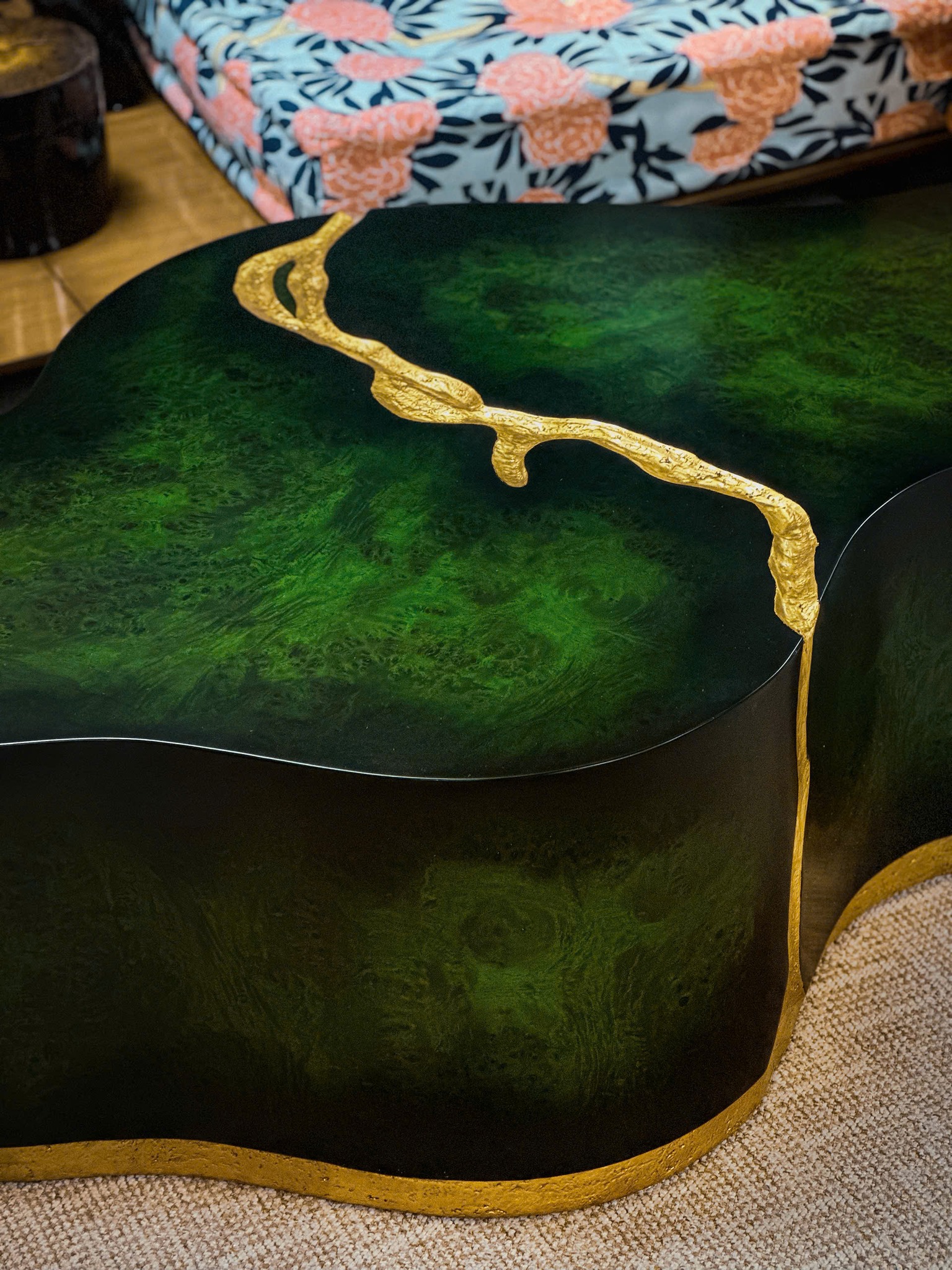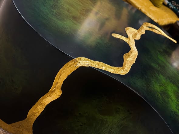 Chiếc bàn được chế tác từ gỗ mahogany, veneer nu gõ đỏ và hoàn thiện bằng nhiều lớp sơn inchem mang tông màu lục bảo Emerald Green. Hiệu ứng bề mặt bóng nhẹ kết hợp glazed giả cổ không chỉ bắt sáng cực tốt mà còn tạo hiệu ứng chiều sâu thăm thẳm. Các chi tiết viền và vân trên mặt bàn được chạm tay và dát vàng lá thủ công, tạo nên những đường chỉ vàng lấp lánh như những mạch quặng quý giá ẩn hiện dưới dòng nước.