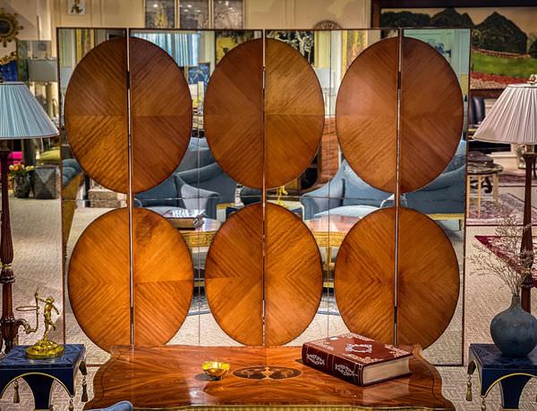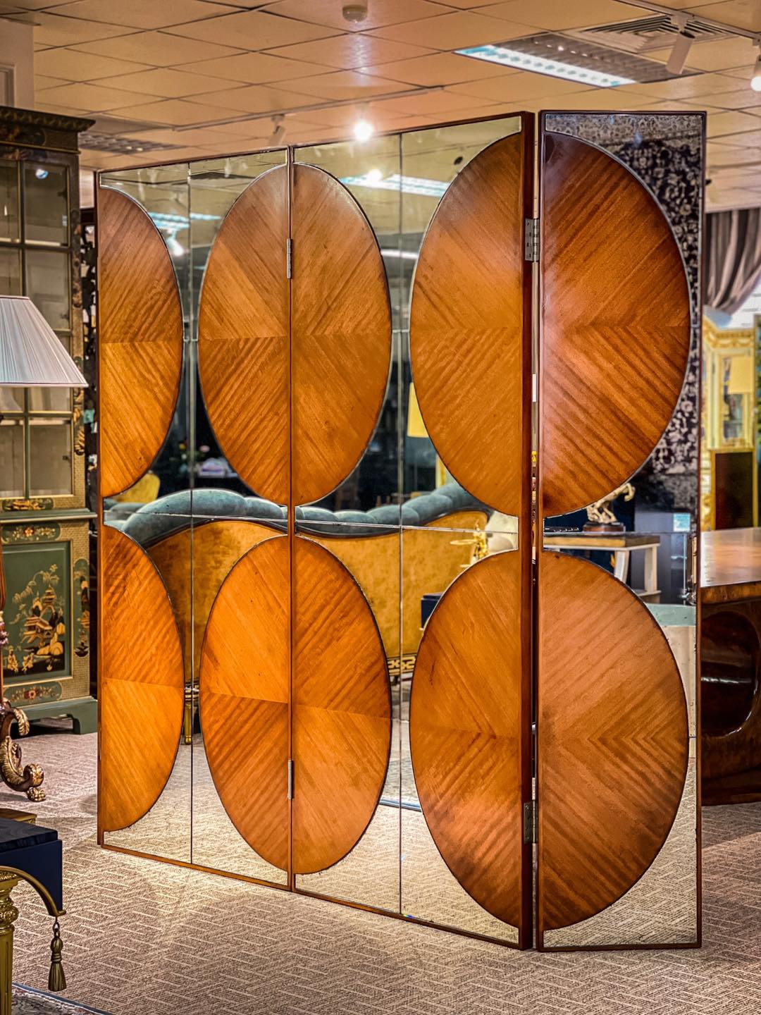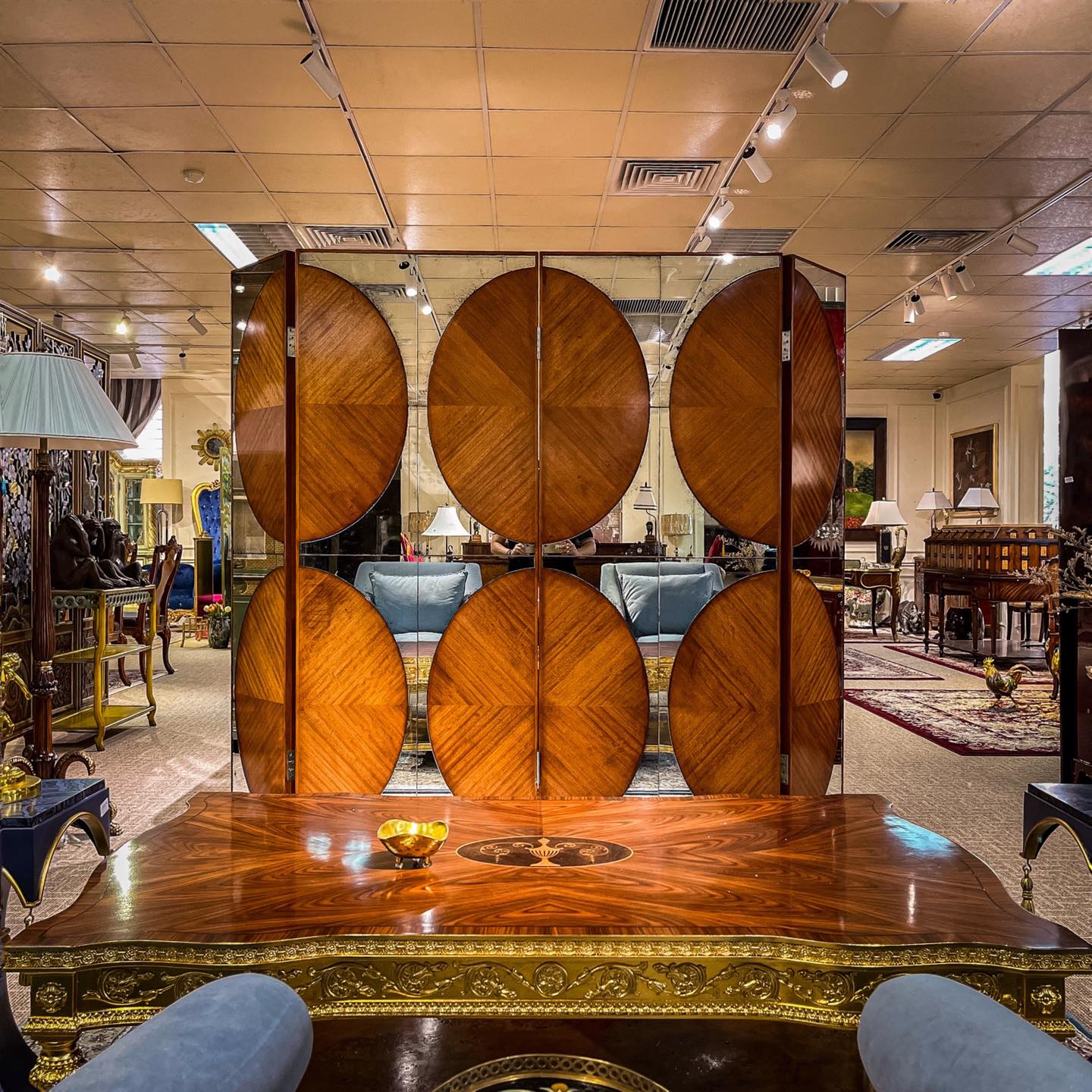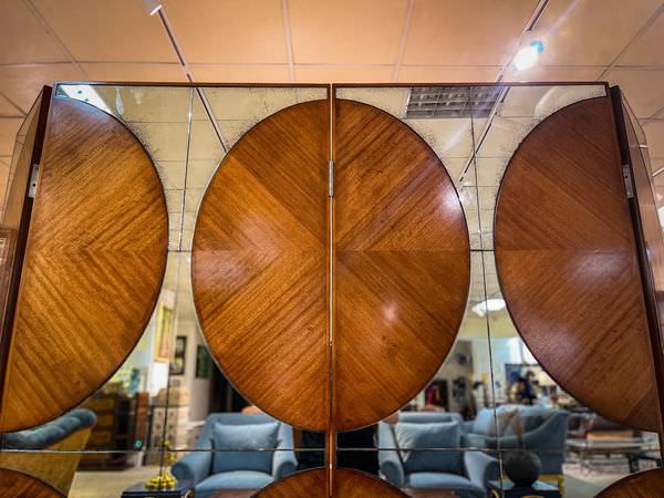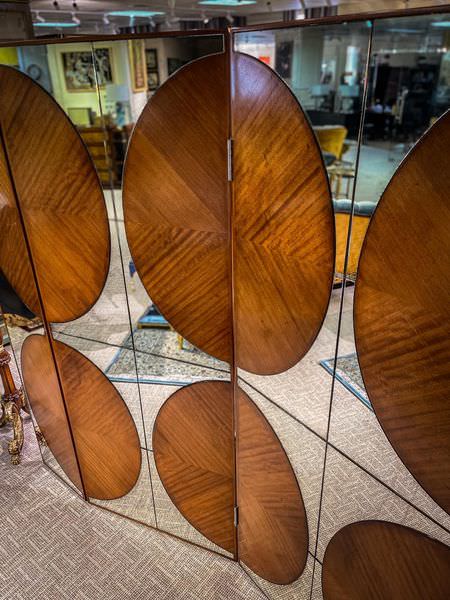 Viền gương làm giả cổ acid. Trung tâm là hình tròn bằng gỗ óc chó inlay tạo điểm nhấn. Cánh kính soi chiếu lẫn nhau tạo hiệu ứng đối xứng và cảm giác chiều sâu.