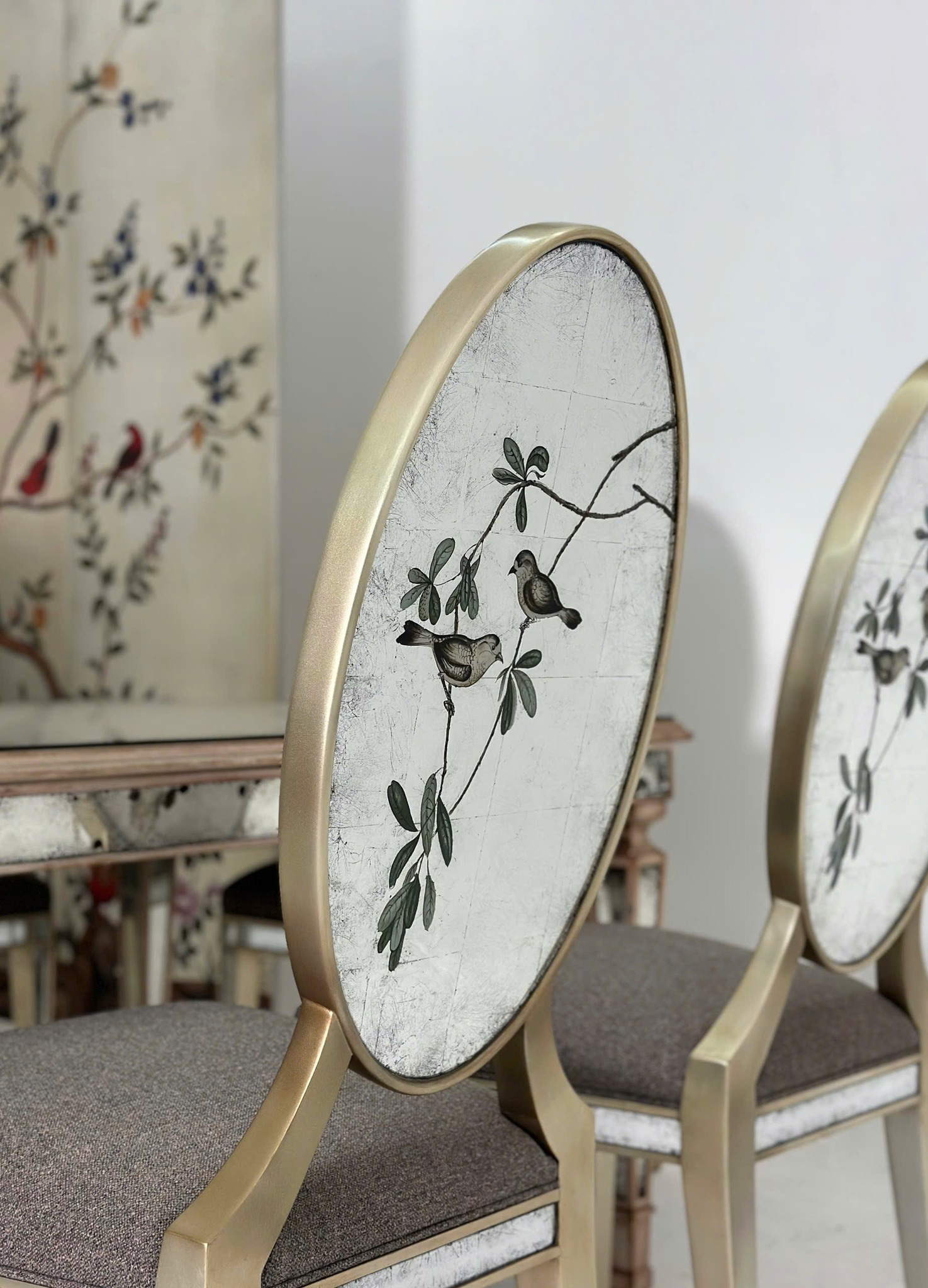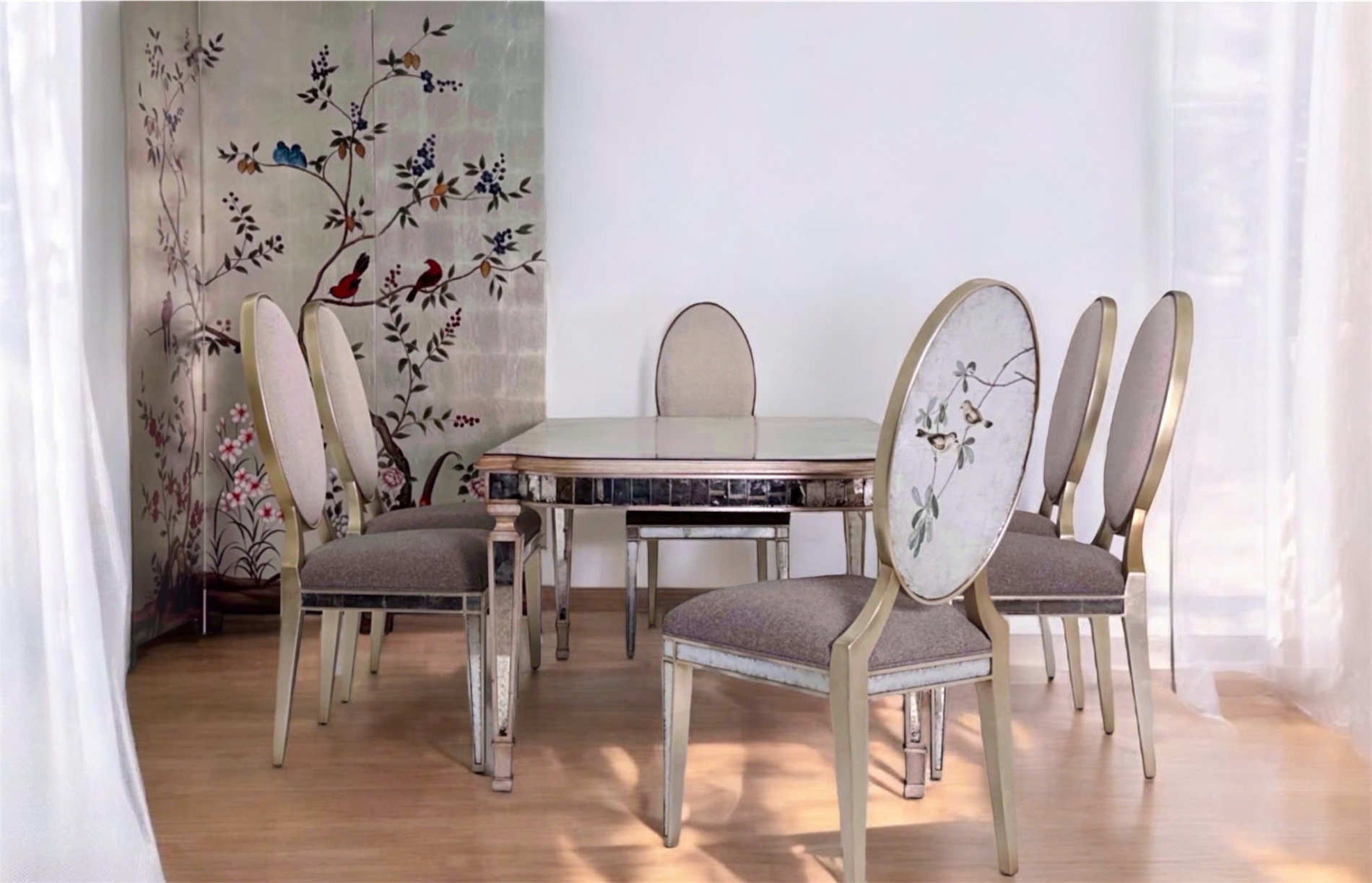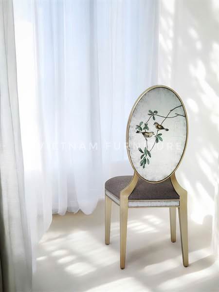 Bàn ăn làm từ gỗ Mahogany, trải qua quy trình dán lá bạc nhiều lớp ten chút ánh hồng . Trên mặt kính , màu bạc không còn đơn điệu mà phảng phất những vết Glaze như vân tuyết, cộng hưởng cùng nét cọ vẽ ngược đậm nhạt, tạo ra chiều sâu khiến bất kỳ ai chạm mắt cũng không muốn rời. Khi ánh đèn vàng ấm chiếu vào, những tấm lá bạc phản quang mềm mại chuyển sang màu champagne tỏa ra vẻ ấm áp như ngọn nến lung linh, khơi dậy những cuộc trò chuyện thân mật.