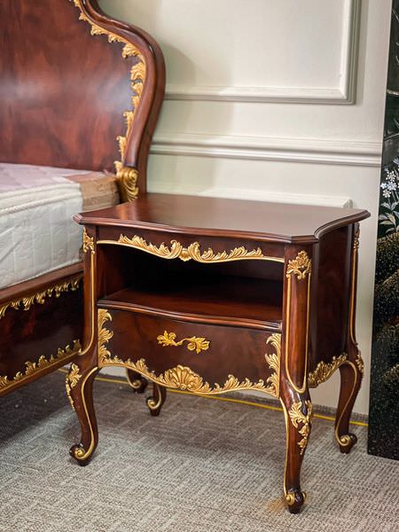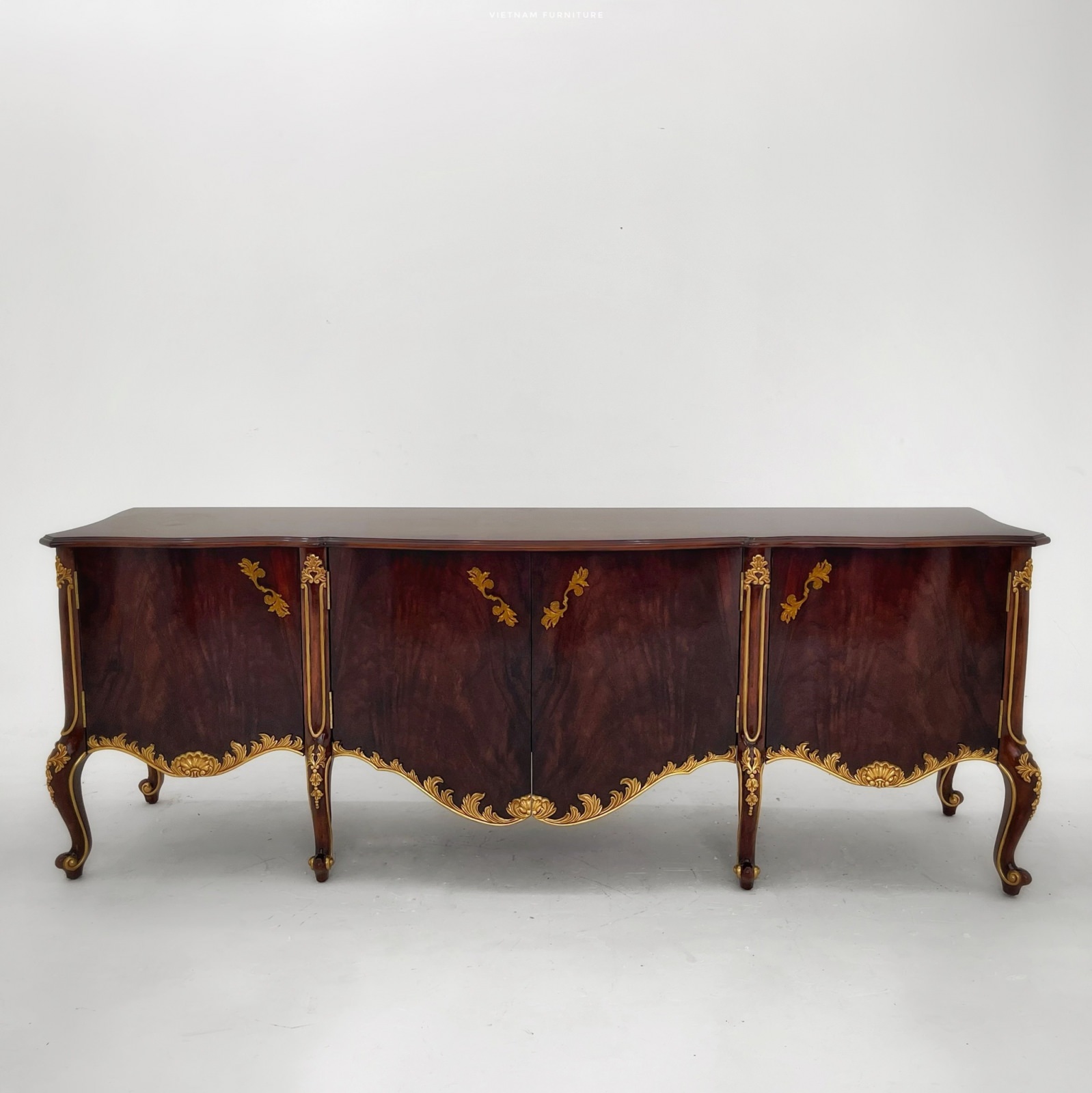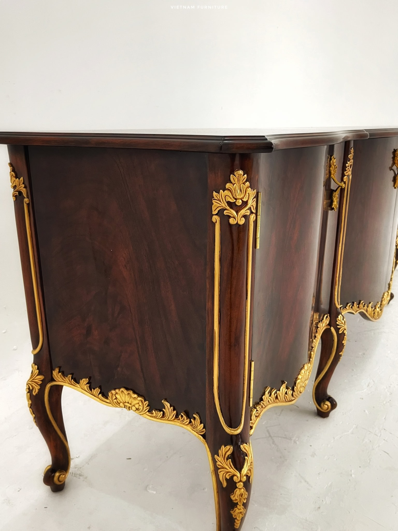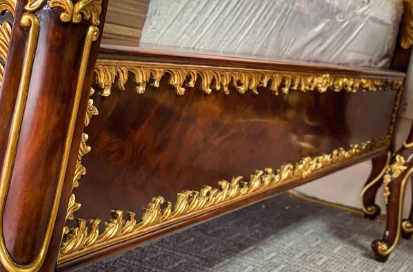 Hoàn thiện: gỗ Mahogany, sơn gốc tự nhiên, sơn giả cổ, lá vàng.
