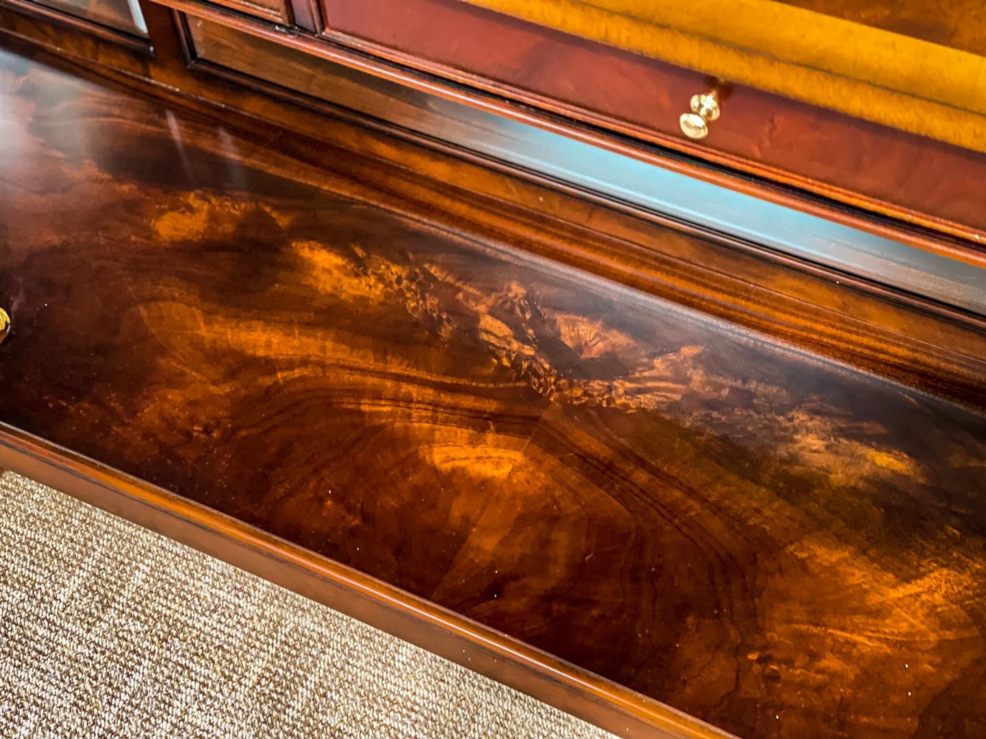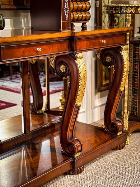 Gỗ Mahogany vân nu, sơn chuyên dụng, mặt gương kính, lá vàng cùng glaze giả cổ.