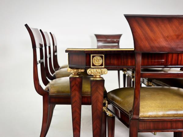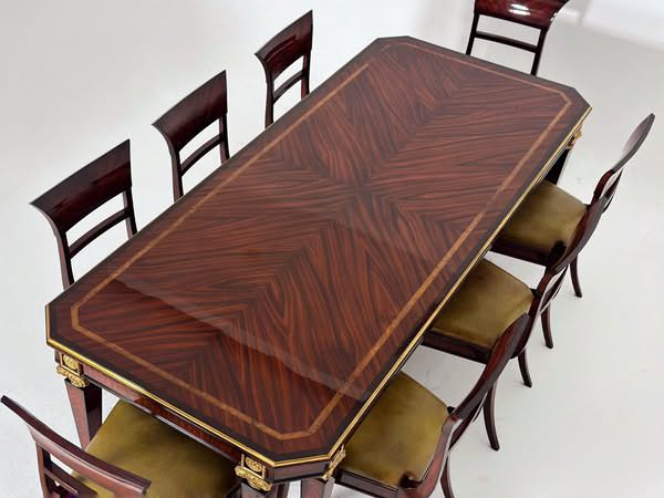 Hãy tưởng tượng xem, ở trung tâm căn phòng trang nhã của bạn, một bộ bàn ghế ăn cổ điển tỏa sáng với những đường cong mềm mại, uyển chuyển như dòng chảy bất tận của thời gian. Mặt bàn vân gỗ Ebony màu nâu trầm khiêm nhường được chế tác tỉ mỉ. Ánh sáng dịu dàng khẽ lướt qua, làm nổi bật những đường nét chạm khắc tinh xảo, những chi tiết mạ vàng óng ánh, tựa như những nốt nhạc ngân nga trong bản giao hưởng của không gian.