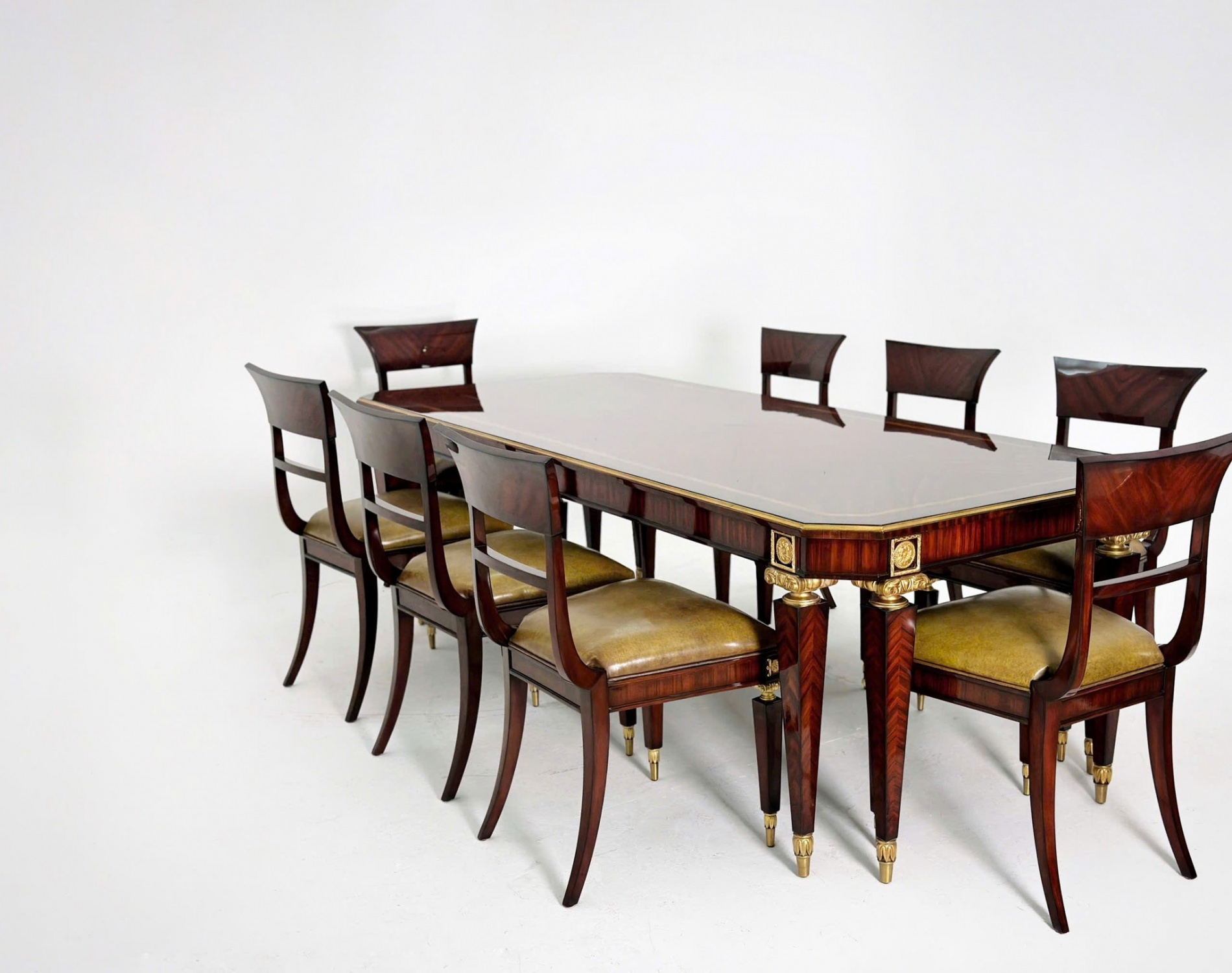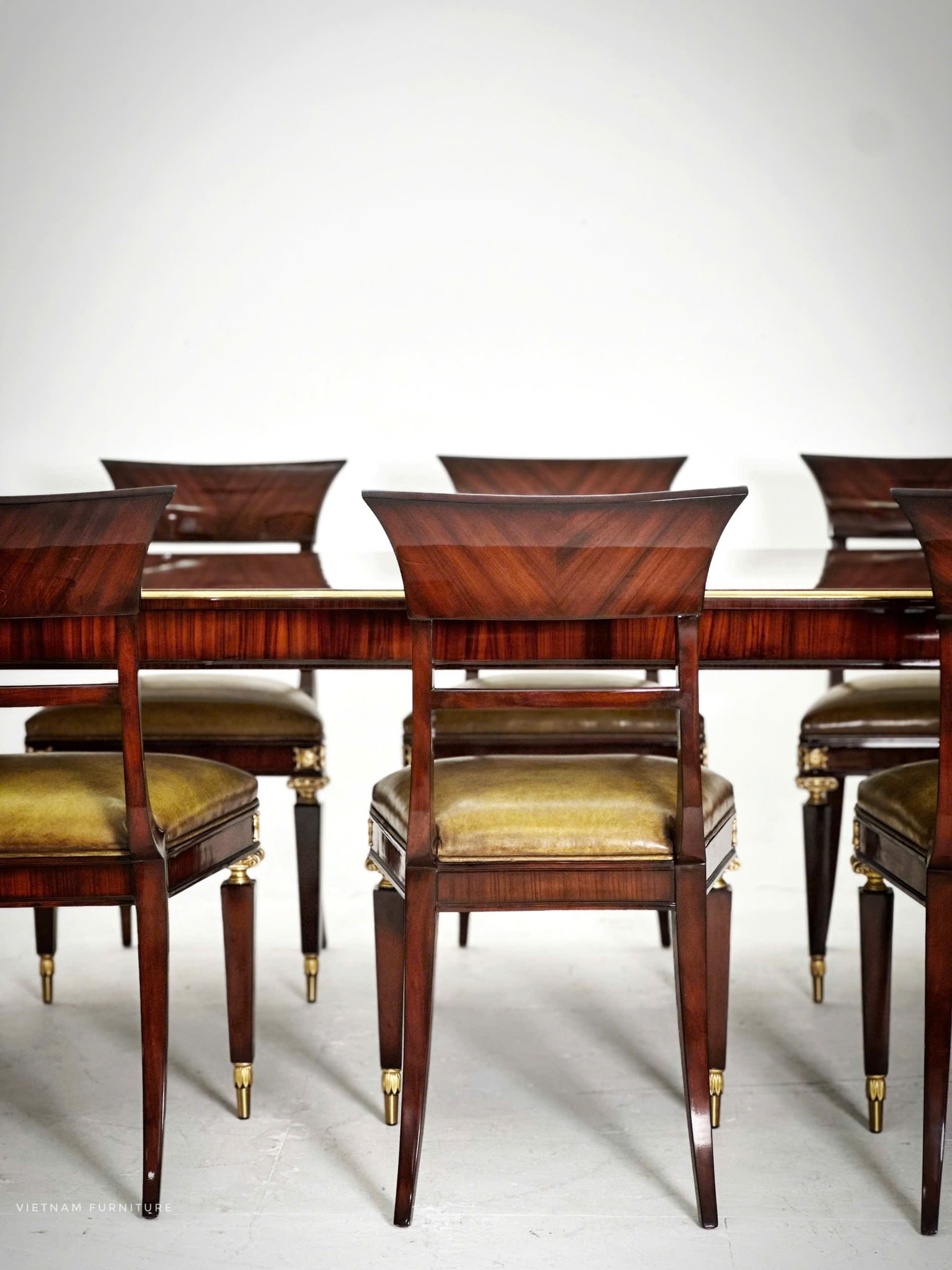 Vây quanh chiếc bàn kiều diễm ấy là những chiếc ghế tựa duyên dáng. Lưng ghế cong nhẹ nhàng ôm trọn lấy dáng người ngồi, mang đến cảm giác thư thái tuyệt vời. Mặt ghế bọc da thật màu olive mềm mại như nhung lụa, gợi nhớ đến những buổi trà chiều tao nhã trong các lâu đài cổ kính. Chân ghế được thiết kế thanh thoát nhưng vô cùng vững chãi, điểm xuyết những họa tiết cổ điển đầy mê hoặc.