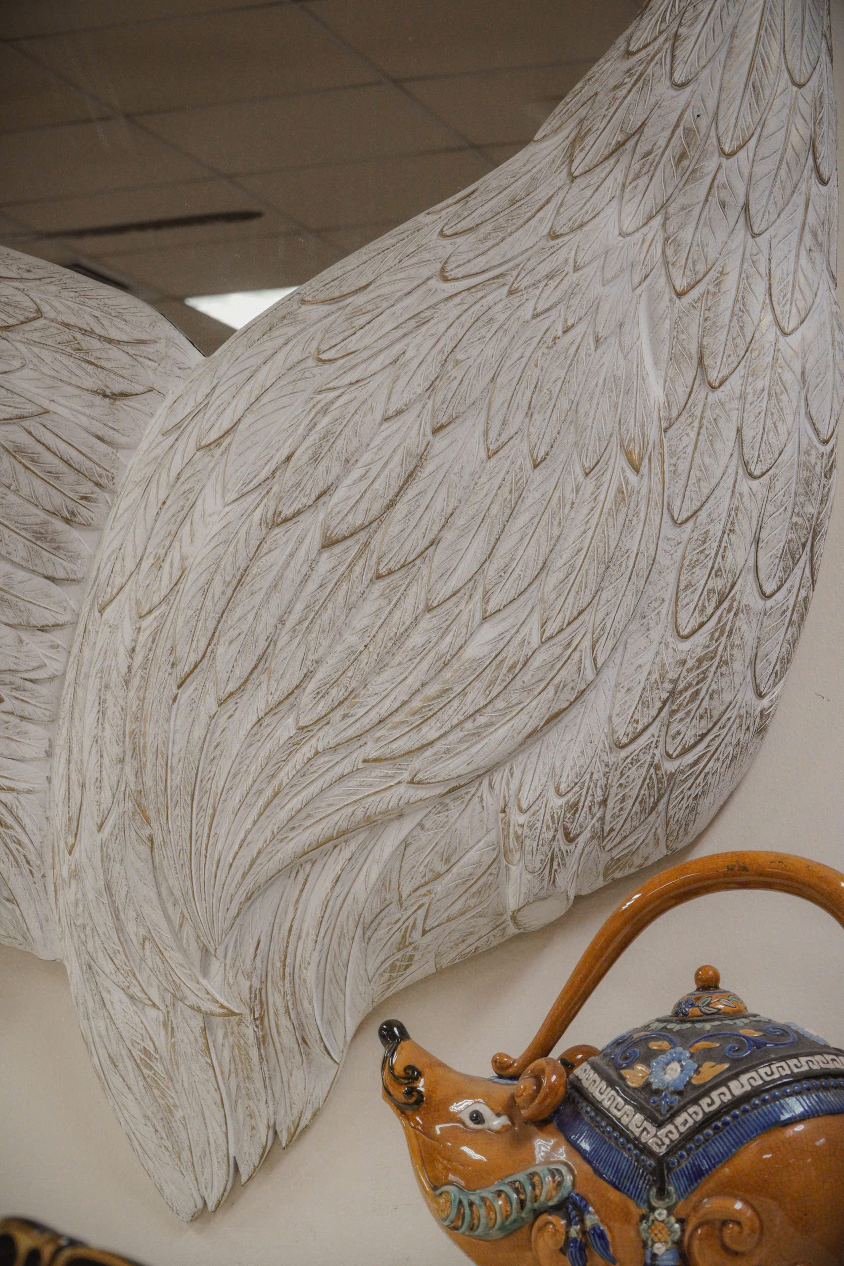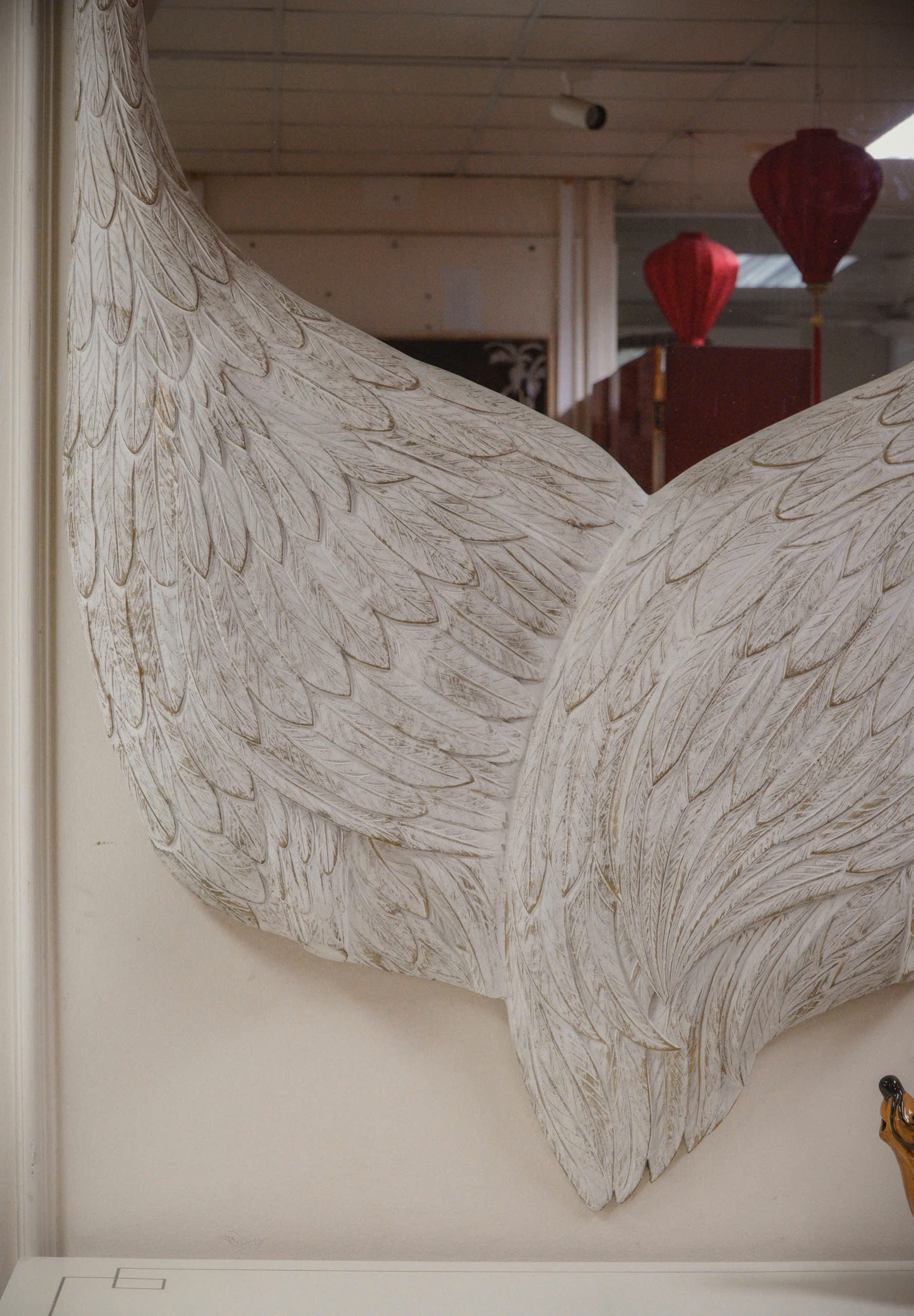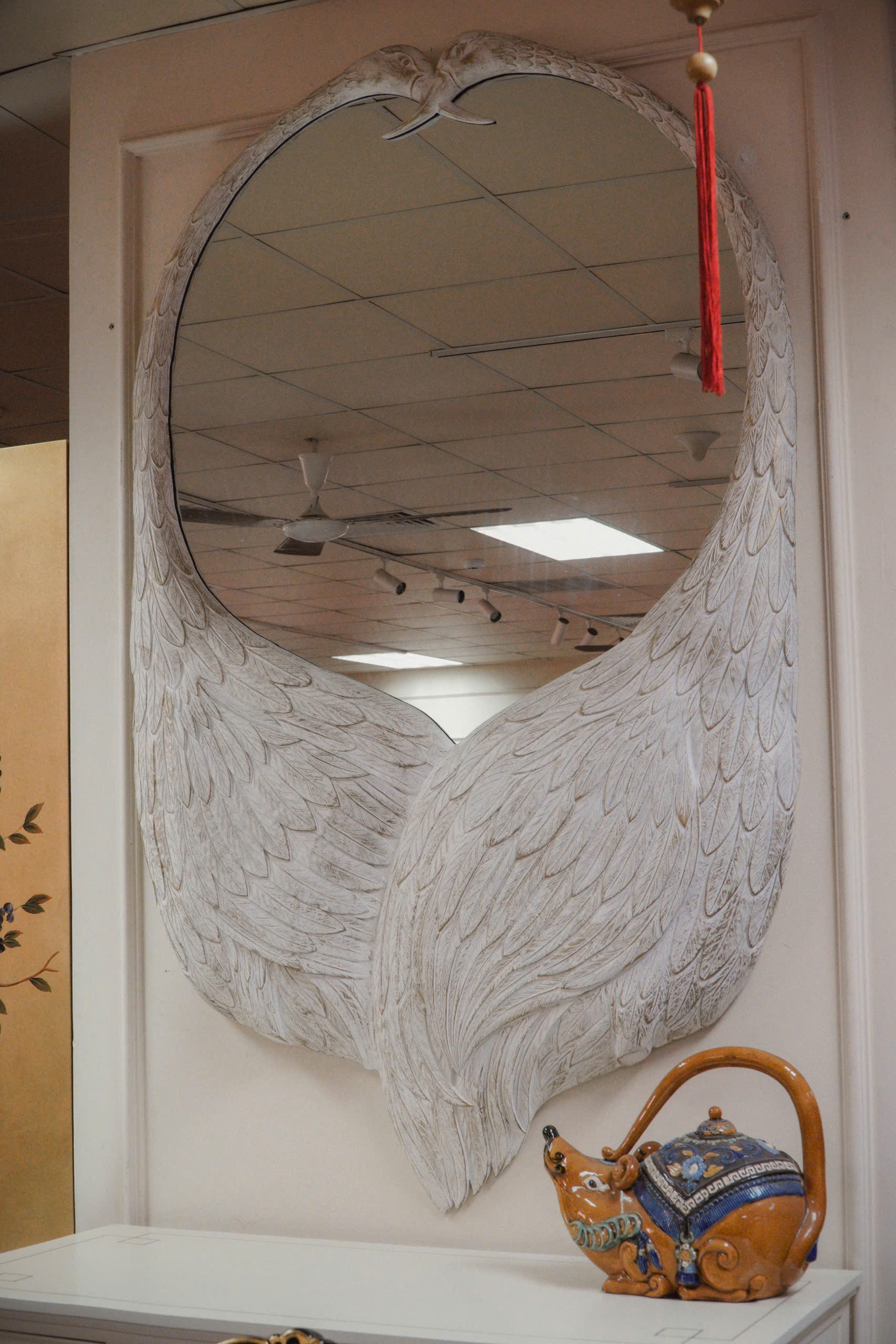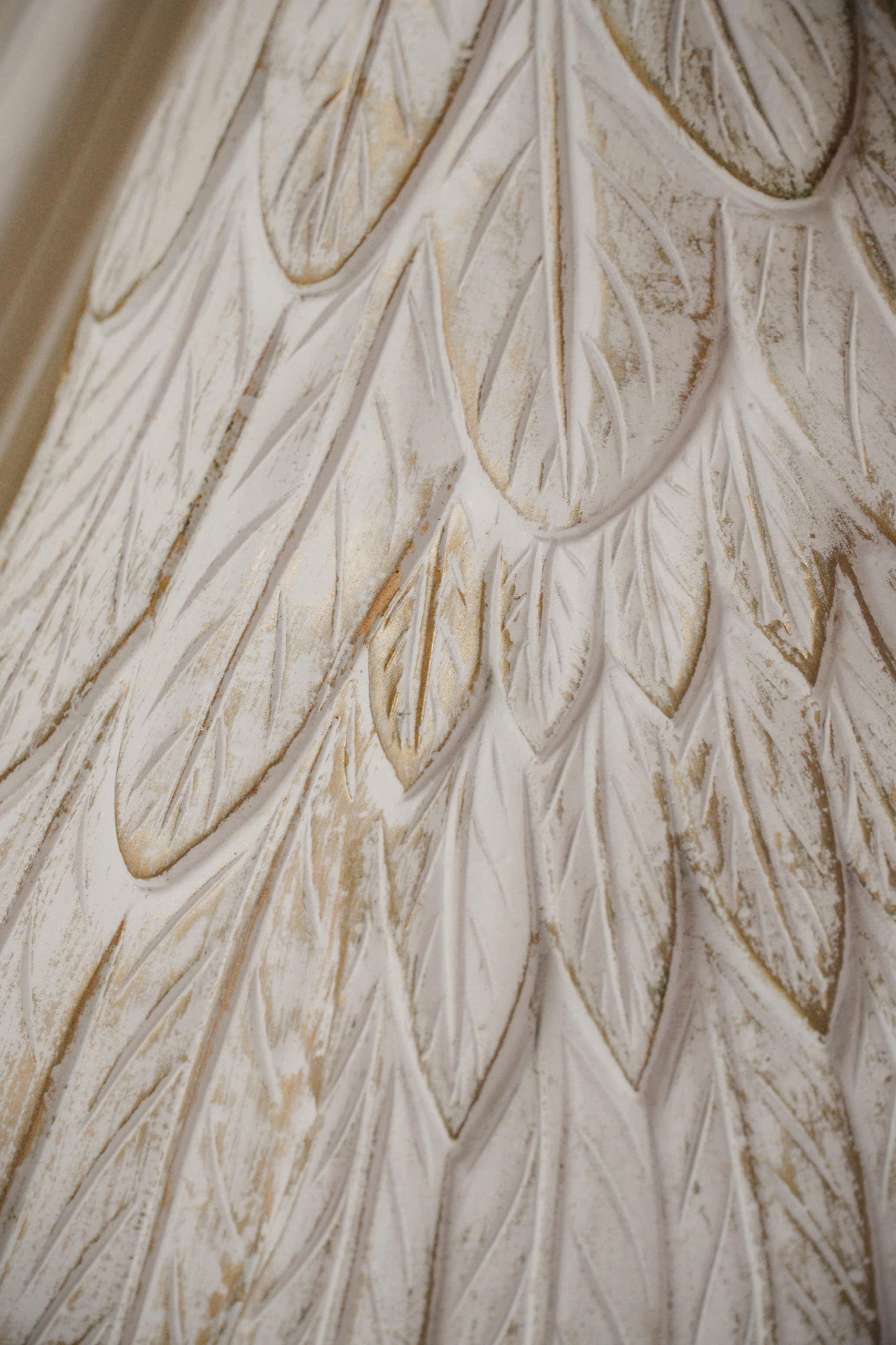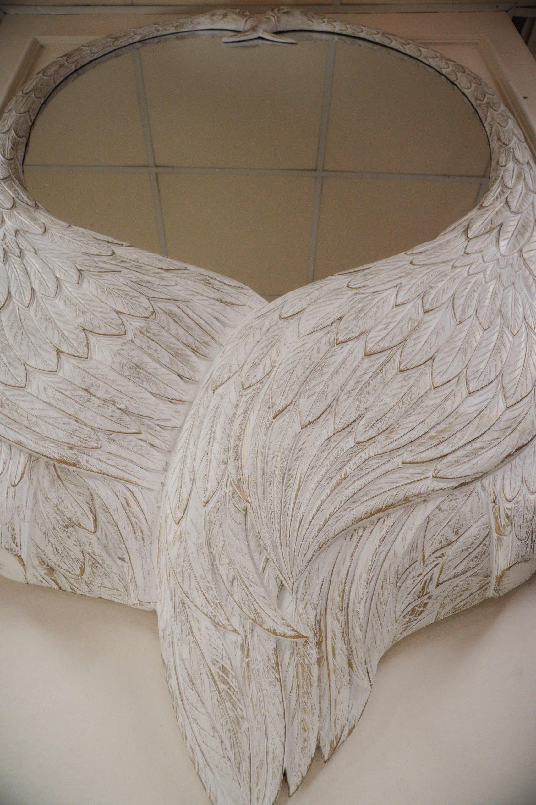 Khung gương được chế tác tinh xảo, nổi bật với kỹ thuật chạm khắc thủ công từng lớp lông vũ một cách sống động. Bề mặt được phủ lớp sơn màu trắng ngà cổ điển (Antique White/Ivory) với hiệu ứng giả cổ (distressing) độc đáo, mang lại cảm giác sang trọng cổ điển.