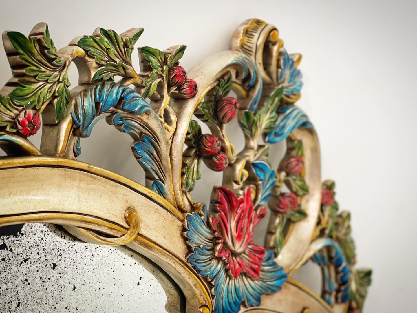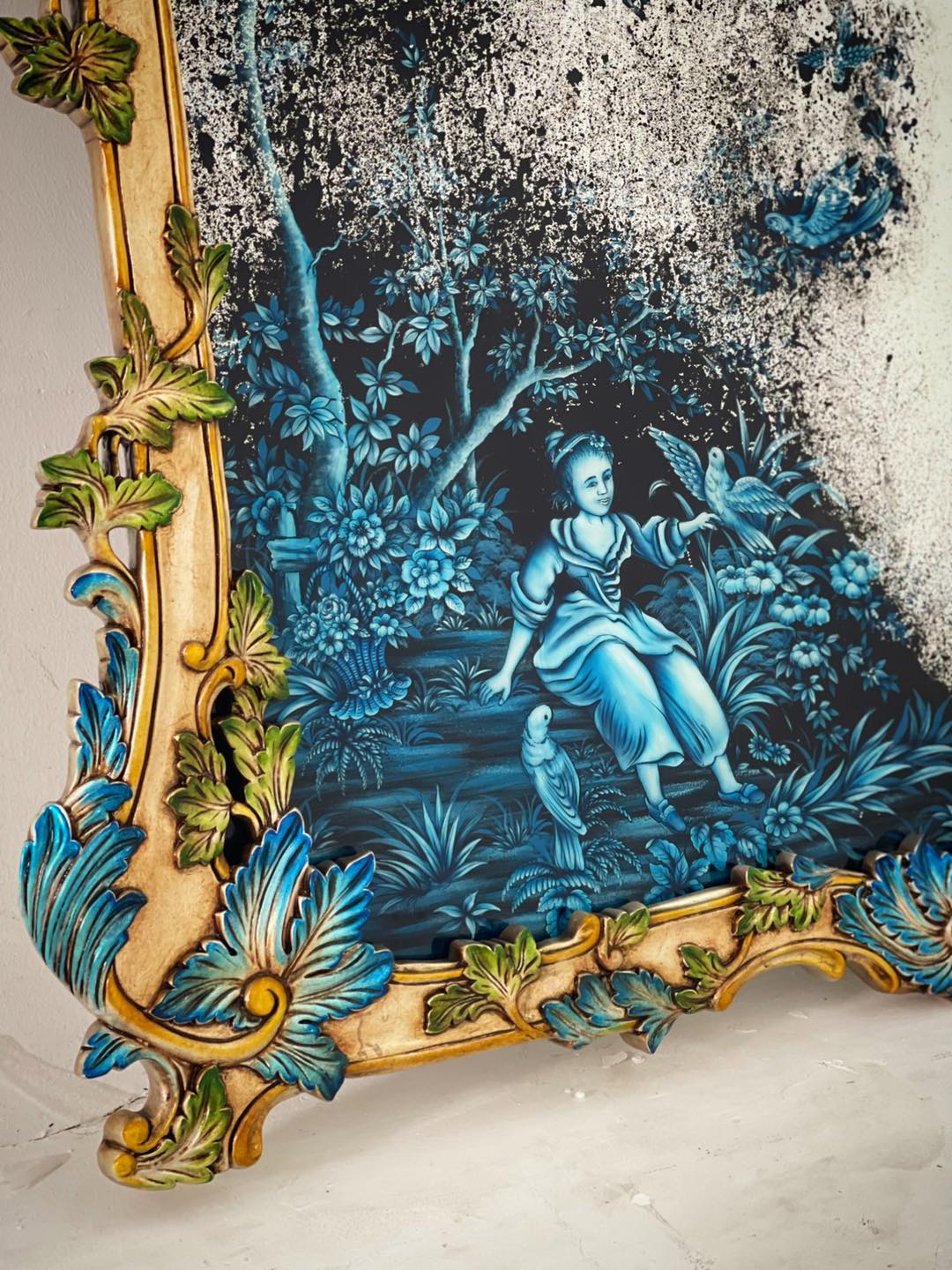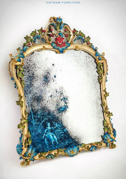 Chiếc gương giả cổ mô phỏng đồ cổ thuộc thời kỳ Louis XV. Khung viền được chạm thủ công bằng tay, họa tiết lá acanthus cầu kỳ uốn quanh. Là gương mà không hẳn để soi. Nó mang tính chất của một vật trang trí, như 1 bức tranh về thời kỳ xưa cổ đã qua. Mình rất tò mò muốn biết một người khách như thế nào sẽ có duyên với chiếc gương này