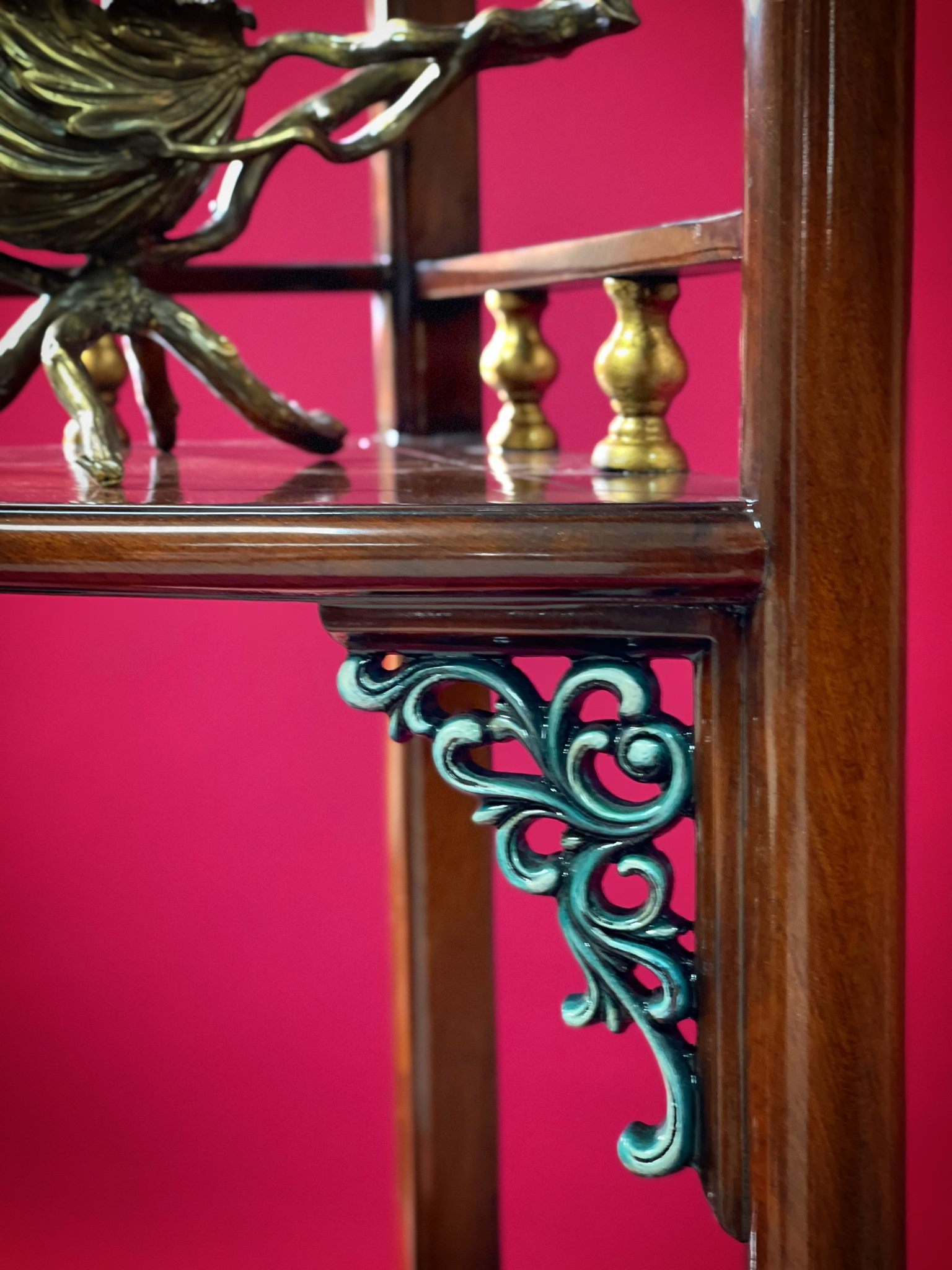 Hoàn thiện: Gỗ Mahogany sơn gốc tự nhiên, lá vàng thật Kích thước: 42x42 H182cm
