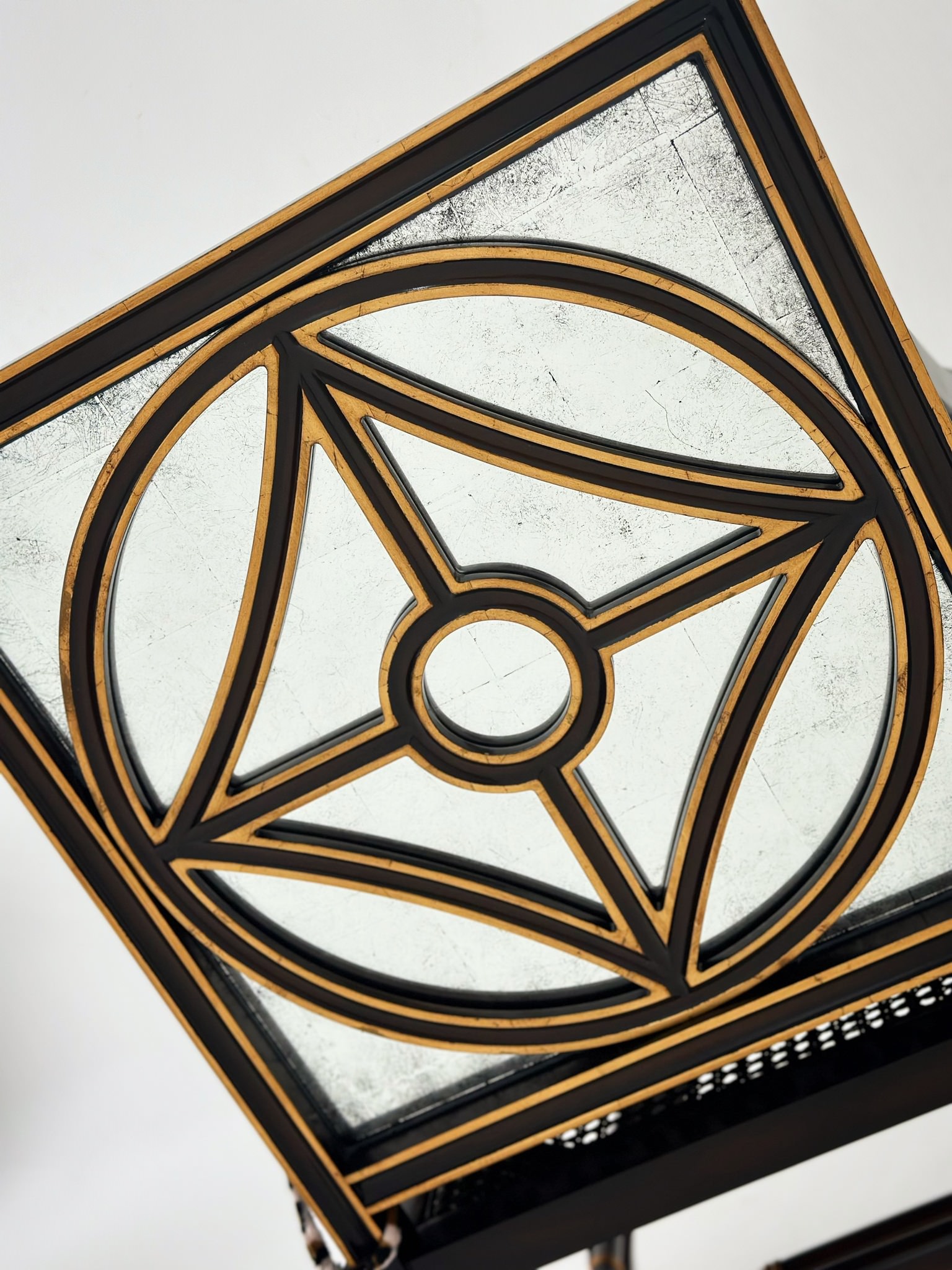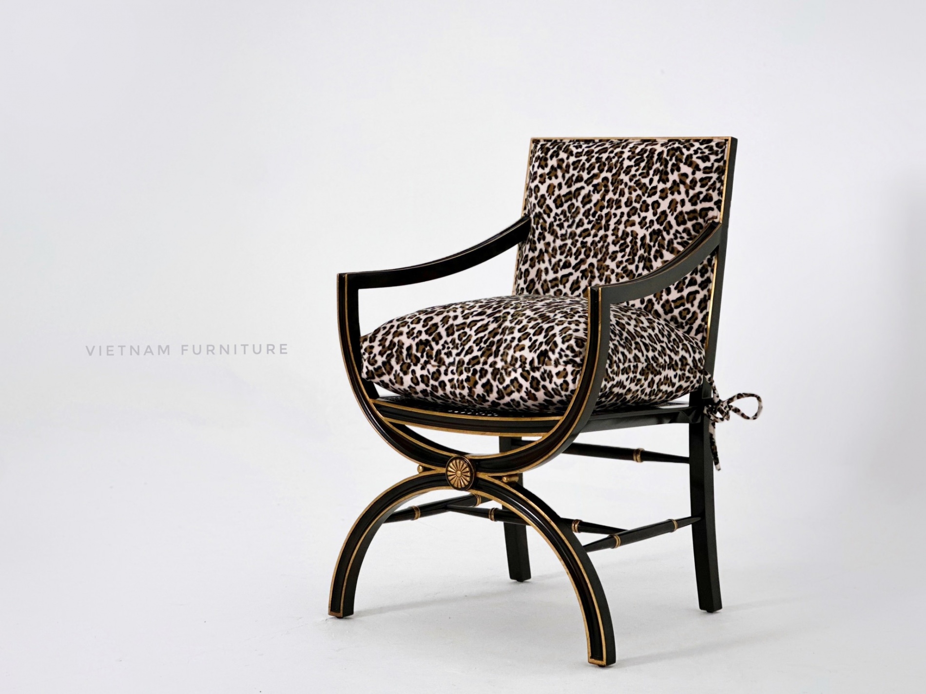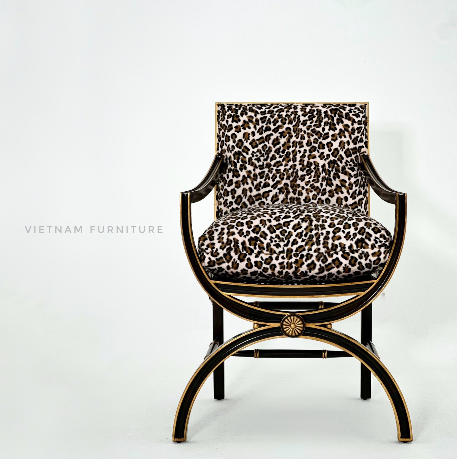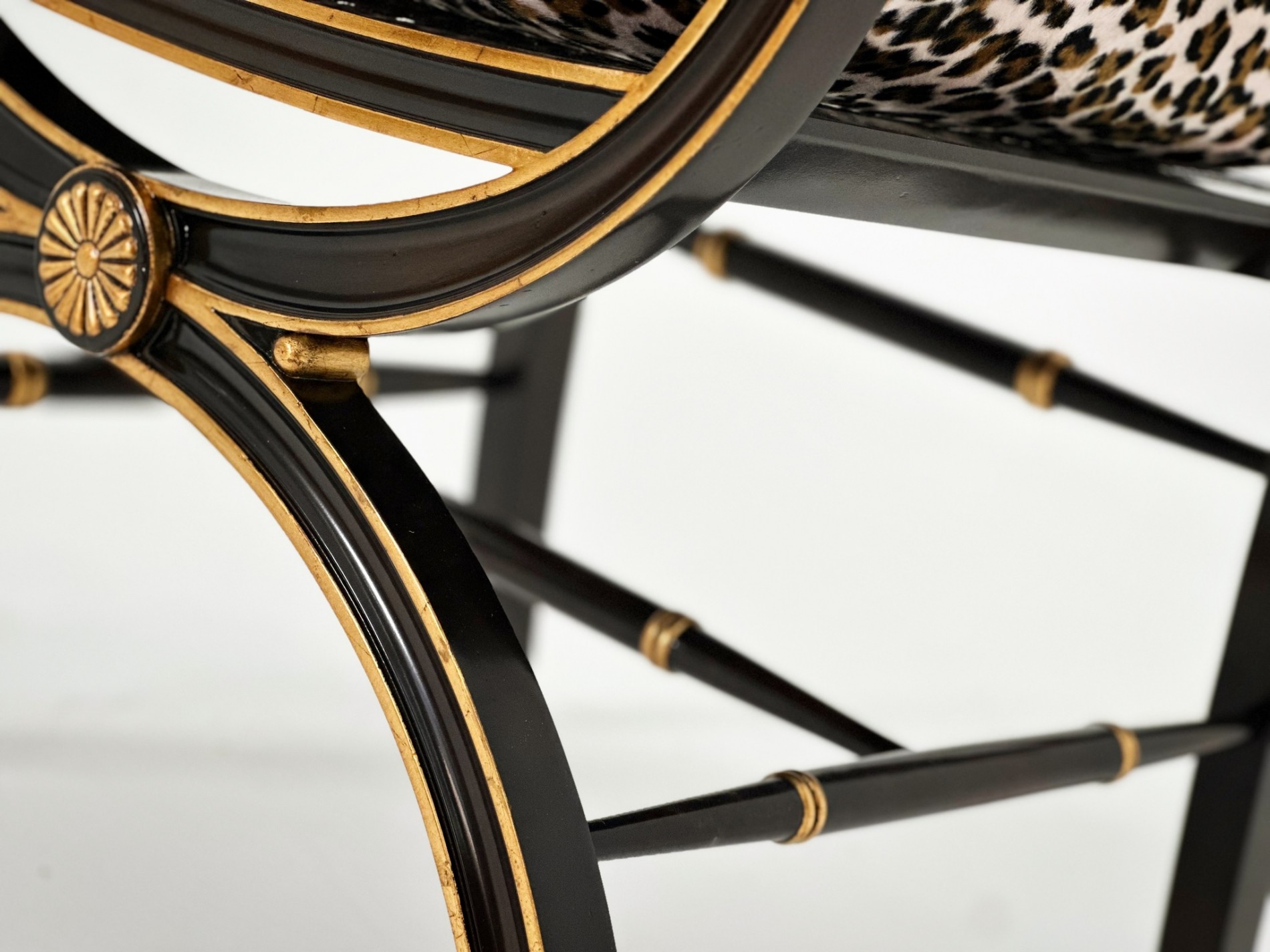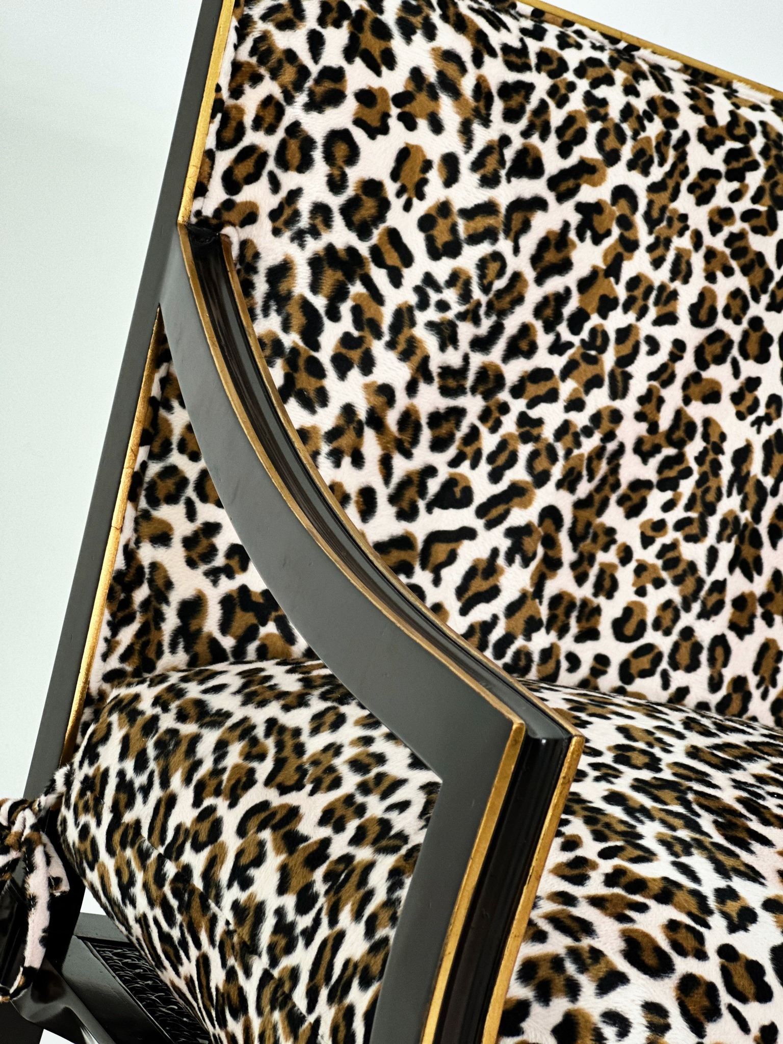 Phần bọc nệm ấn tượng với họa tiết da beo sắc sảo. Phần lưng ghế gồm mặt gương giả cổ Églomisé kết hợp cùng khung gỗ mun, tạo điểm nhấn với lớp sơn vàng gold.