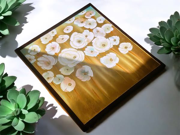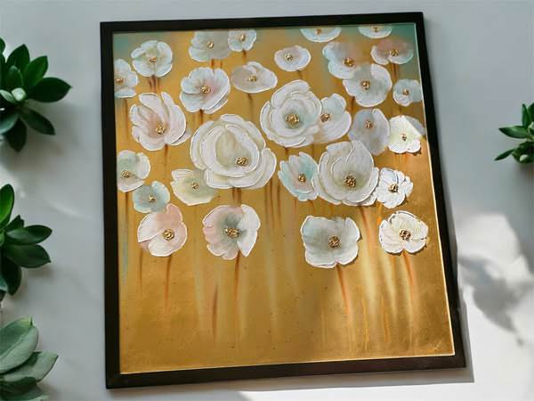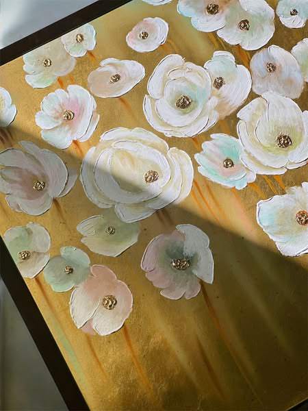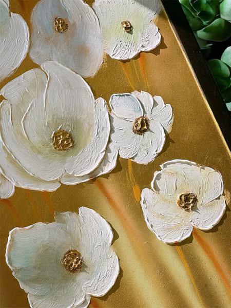 • Bức tranh với bố cục tả cảnh những bông hoa chuyển động nhẹ nhàng, được sắp xếp có chủ ý để sắc trắng trải đều trên nền lá vàng ấm áp. Điểm thêm đó chút xanh và hồng nhẹ nhàng tạo nên một tổng thể hài hòa, thanh thoát. Như một bản tình ca về mùa hạ, những đóa hoa trắng tinh khôi khoe sắc trên nền vàng rực rỡ, mang đến cảm xúc bình yên và thư thái cho người thưởng ngoạn. Kỹ thuật impasto được thể hiện qua những nét cọ đậm đà, tạo độ nổi cho từng cánh hoa, khiến chúng như muốn vươn ra khỏi bề mặt tranh. Sự kết hợp giữa sơn dầu và lá vàng không chỉ tạo nên hiệu ứng thị giác đẹp mắt mà còn mang đến chiều sâu và sự sang trọng cho tác phẩm.