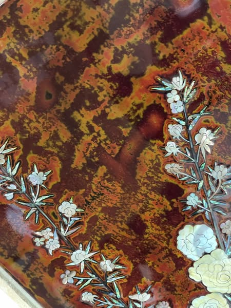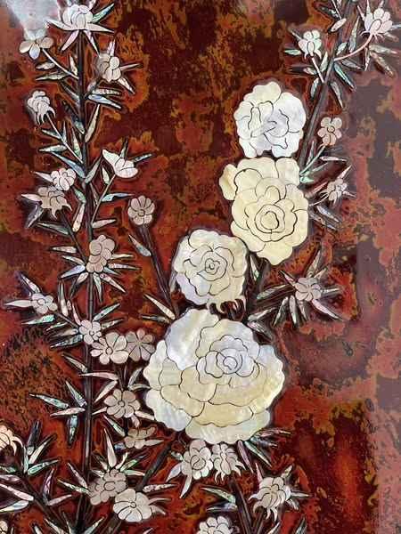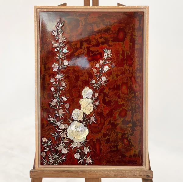 Trên nền sơn mài màu nâu đỏ ấm áp, những đóa hoa trắng ngần được cẩn từ vỏ xà cừ lấp lánh hiện lên đầy sống động. Từng cánh hoa, chiếc lá được người nghệ nhân khéo léo sắp đặt, tạo nên một tổng thể hài hòa, uyển chuyển. Ánh sáng chiếu vào, xà cừ tỏa ra sắc cầu vồng huyền ảo, khiến bức tranh có hồn hơn. Tác phẩm không chỉ là một vật trang trí mà còn là một câu chuyện về sự thanh khiết, e ấp của loài hoa, gửi gắm vẻ đẹp của thiên nhiên qua bàn tay tài hoa của người nghệ nhân Việt.