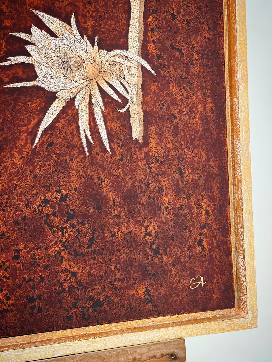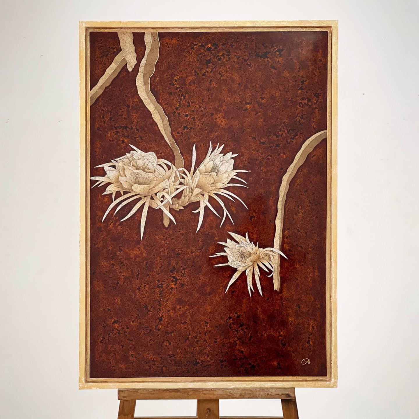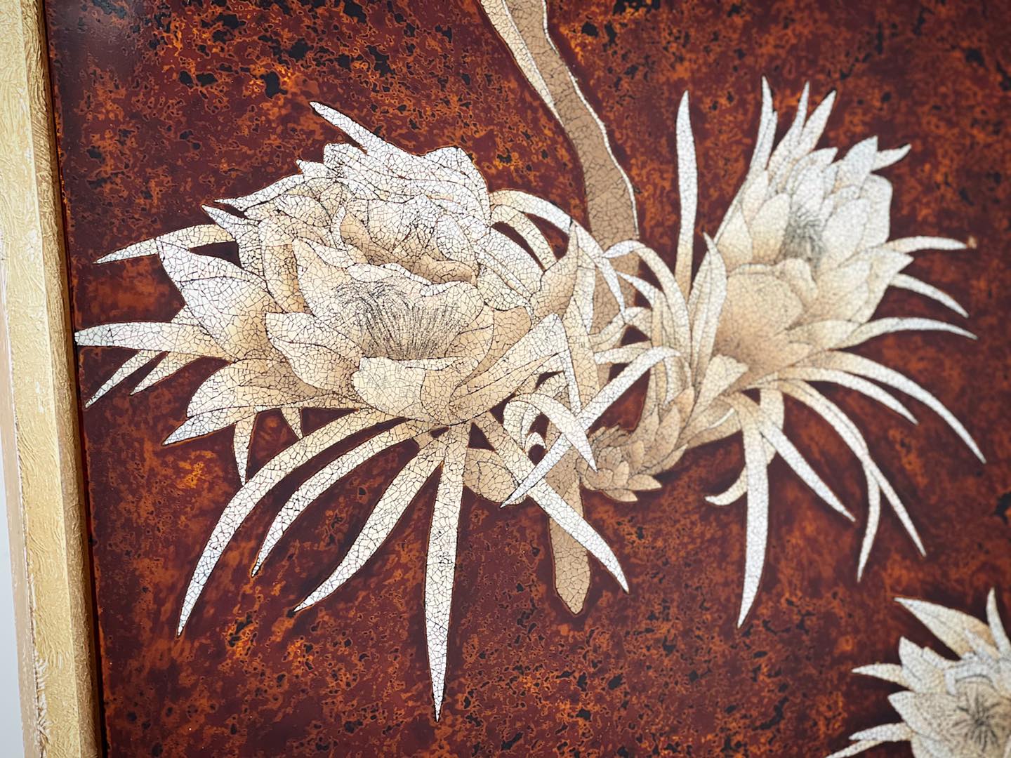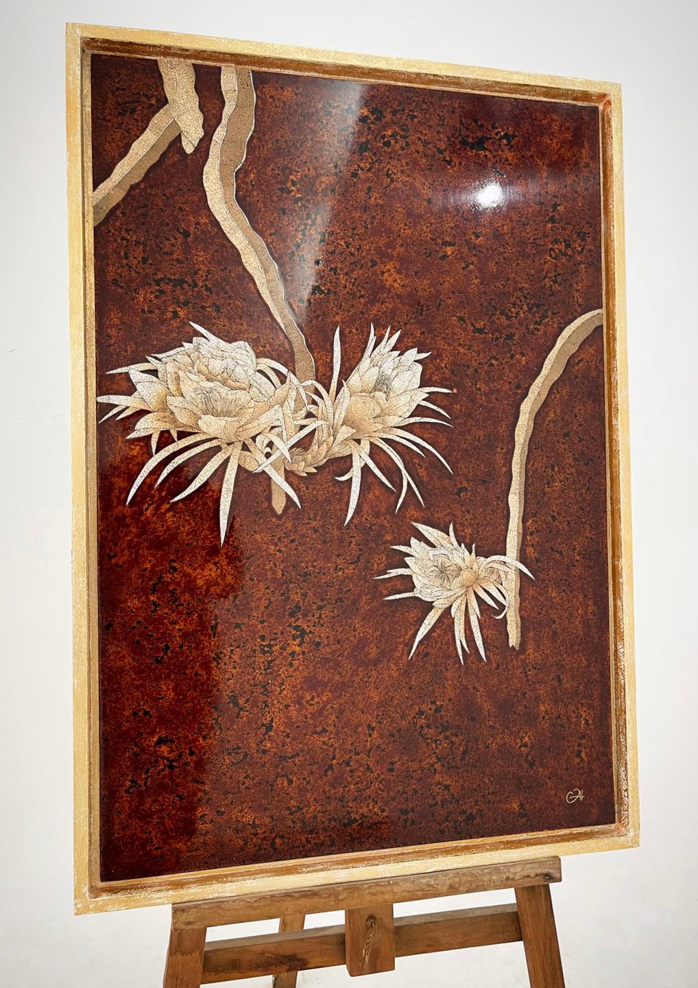 Sơn mài cẩn trứng nhành cây hoa, nền vỗ gai, nền nâu đỏ glazed. |