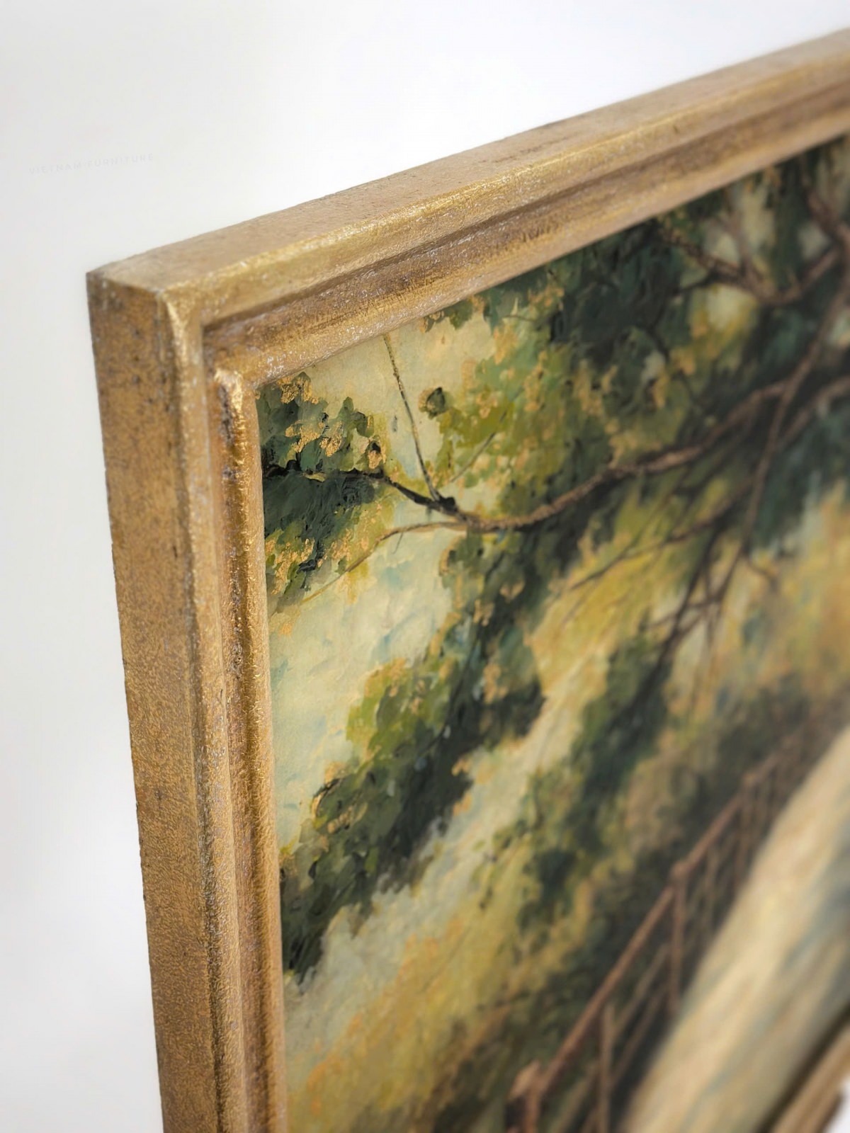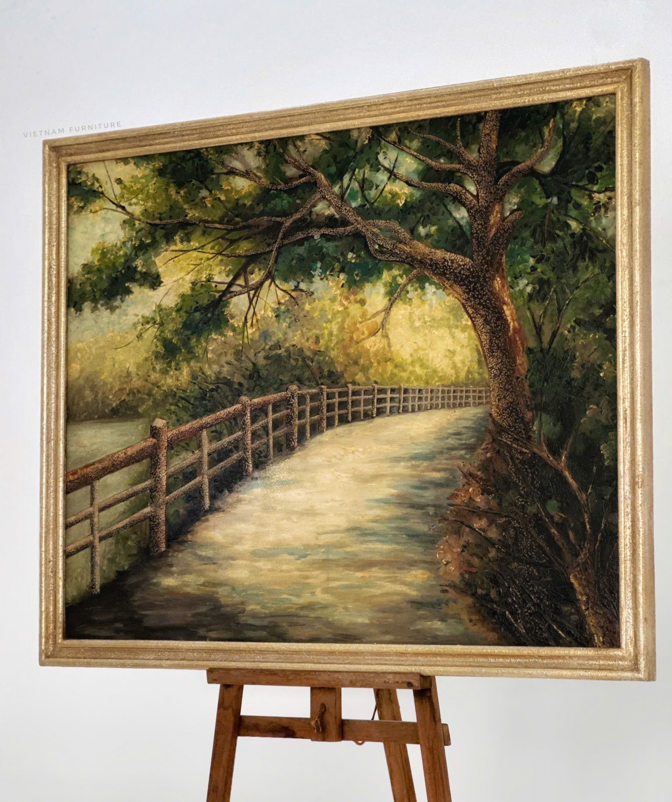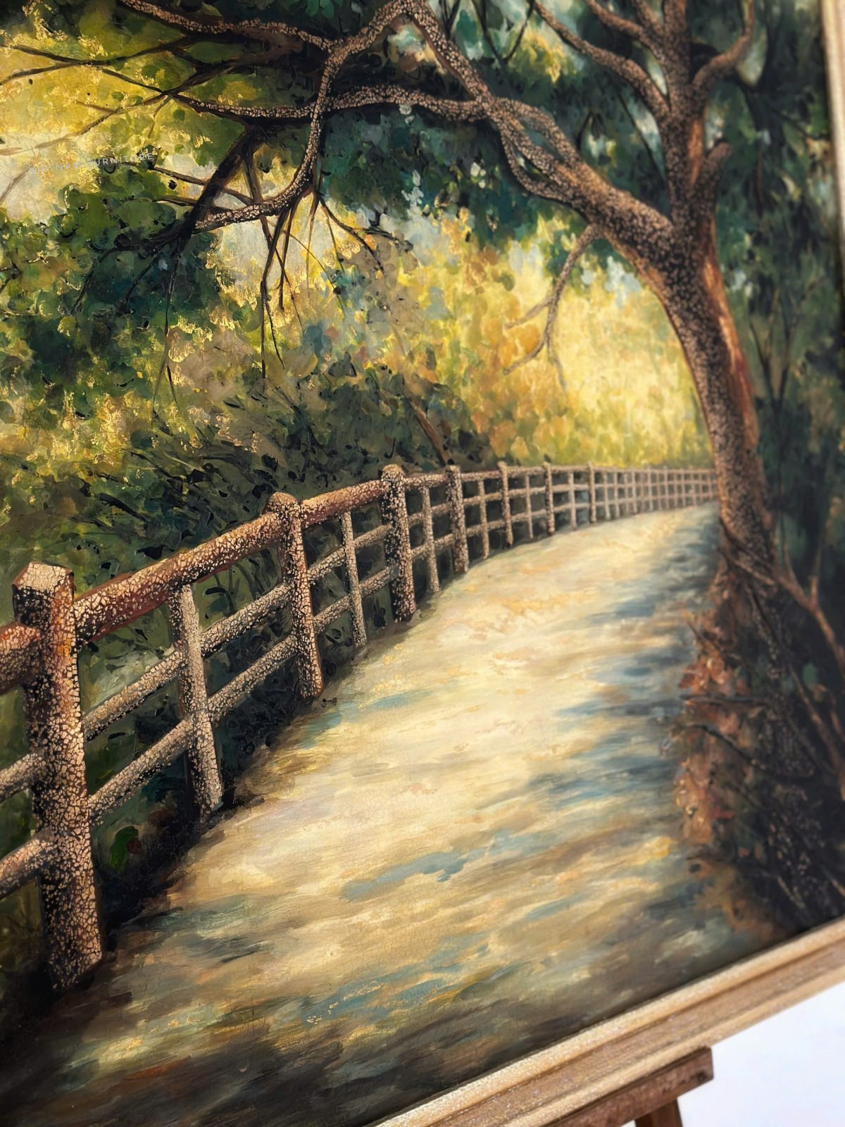 Tranh sơn mài họa cảnh con đường, hai bên là rừng cây mùa xuân.