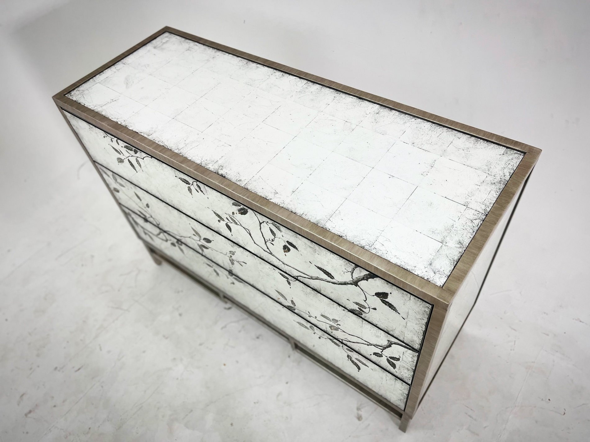 Kích thước: 122 x 46 x 92 cm Mẫu tủ ngăn kéo được hoàn thiện công phu với lá bạc đánh bóng và tranh vẽ phong cách églomisé của hãng.