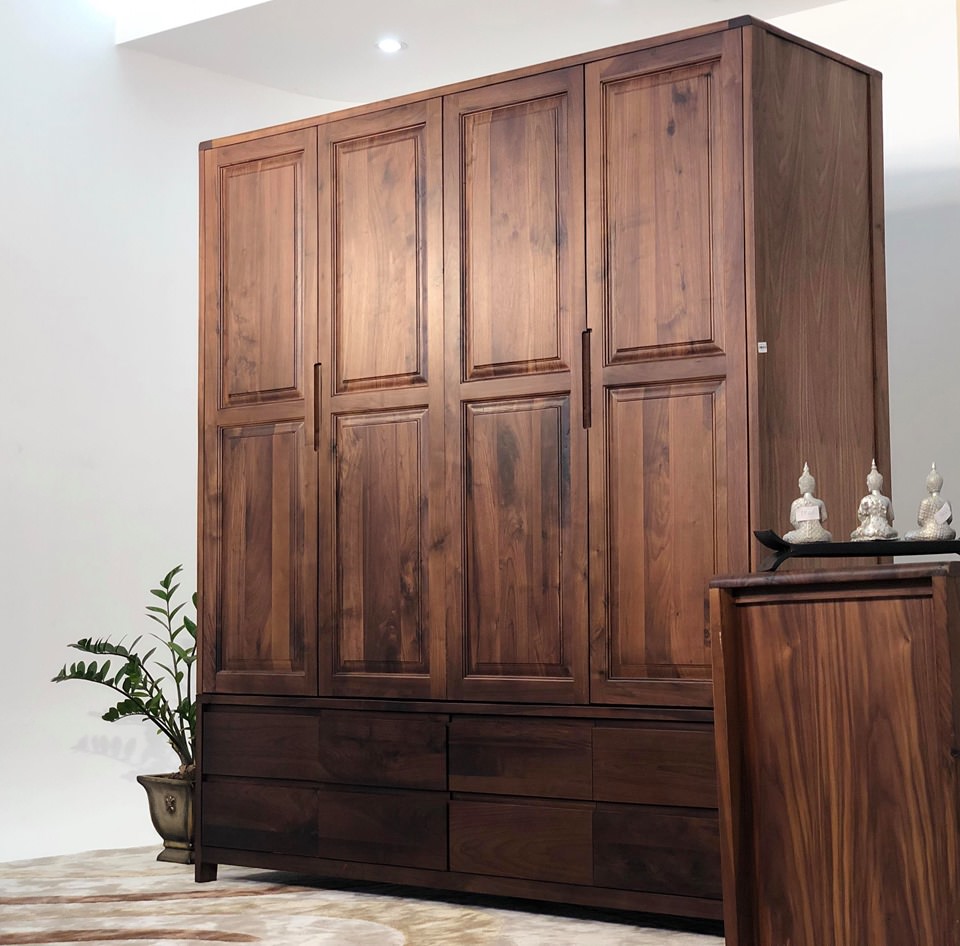 Tủ được làm từ gỗ Óc chó nhập khẩu – một loại gỗ bền đẹp được ưa chuộng trên khắp thế giới. sản phẩm chịu ma sát tốt, thích nghi nhanh chóng với môi trường, giữ độ khô thoáng giúp sách luôn mới là đặc tính của gỗ óc chó, được tẩm sấy không cong vênh, chống mối mọt. Tủ có chất lượng hoàn thiện tốt và rất tiện dụng. Kết cấu tủ gồm 8 ngăn kéo và 4 cánh mở với đợt để đồ và thanh treo áo. Thiết kế hiện đại đơn giản, thích hợp cho nhiều phong cách nội thất.