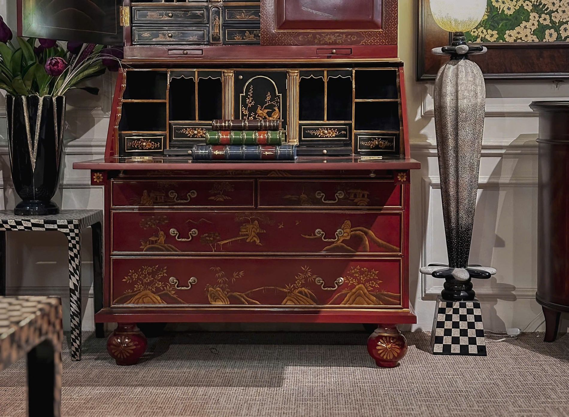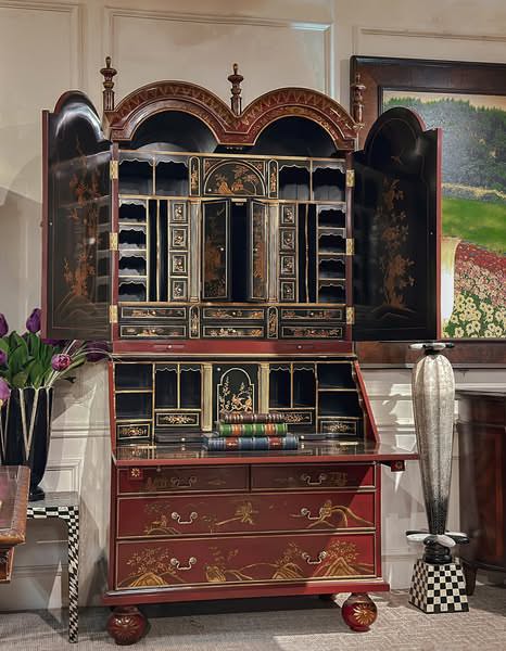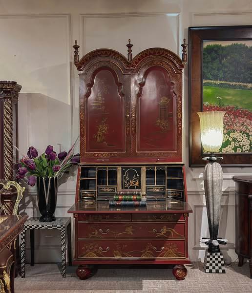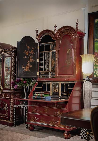 • Phong cách Chinoiserie xuất hiện từ thế kỷ 17 và đạt đỉnh cao vào giữa thế kỷ 18, khi giới quý tộc châu Âu coi đây là thú chơi tao nhã. Chiếc tủ này là hiện thân của xu hướng ấy: được chế tác từ gỗ Mahogany phủ lớp chồng lớp sơn mài đỏ đô bóng loáng.