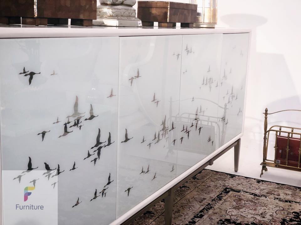 Bộ bàn sofa Migration gồm 3 chiếc bàn với 1 bàn lớn center và hai bàn nhỏ mở rộng, mặt bàn vẽ tay thủ công đàn chim hạc đang bay theo đàn trên nền kính trắng thanh khiết. Chân bàn dát bạc lá giả cổ.
