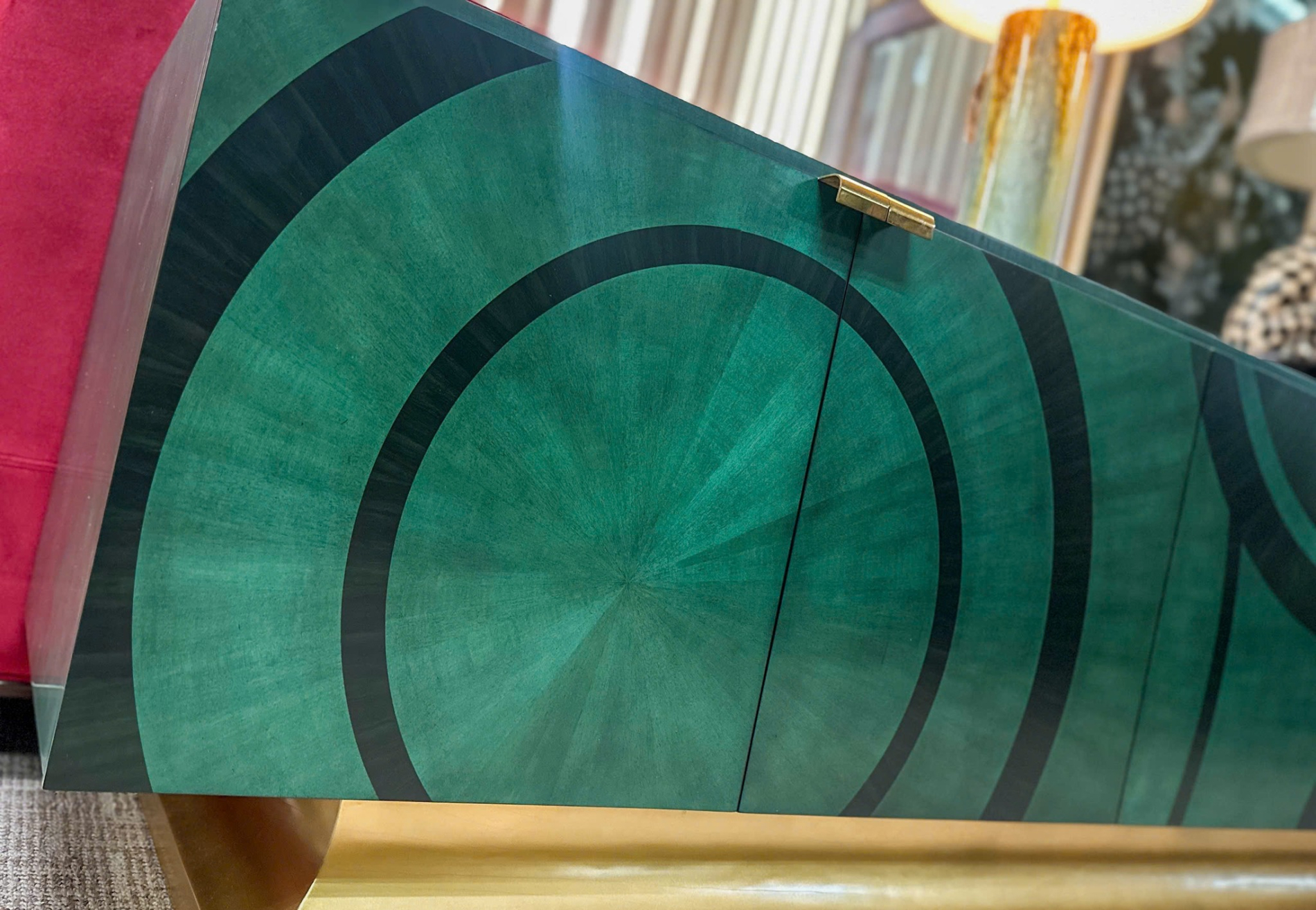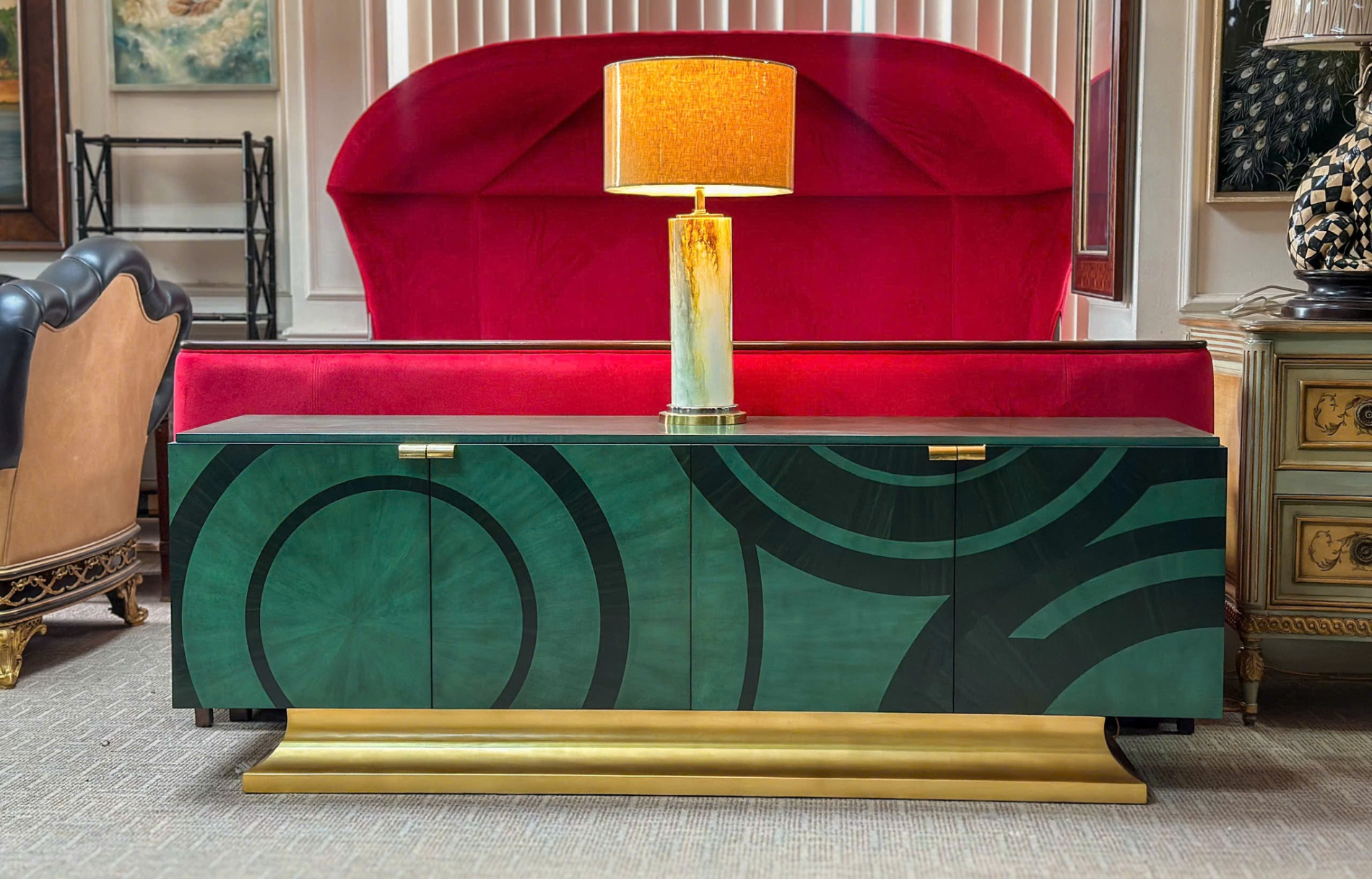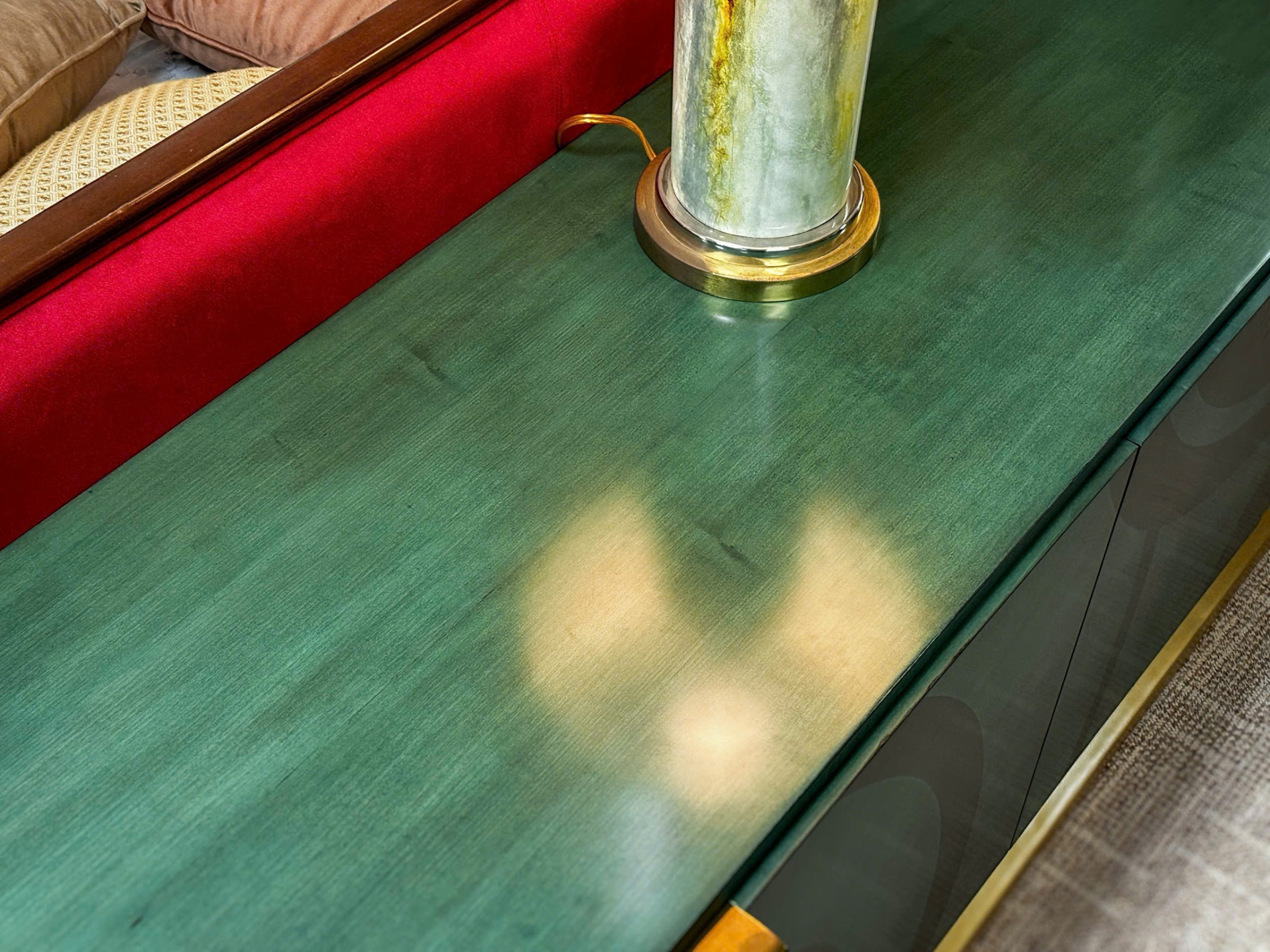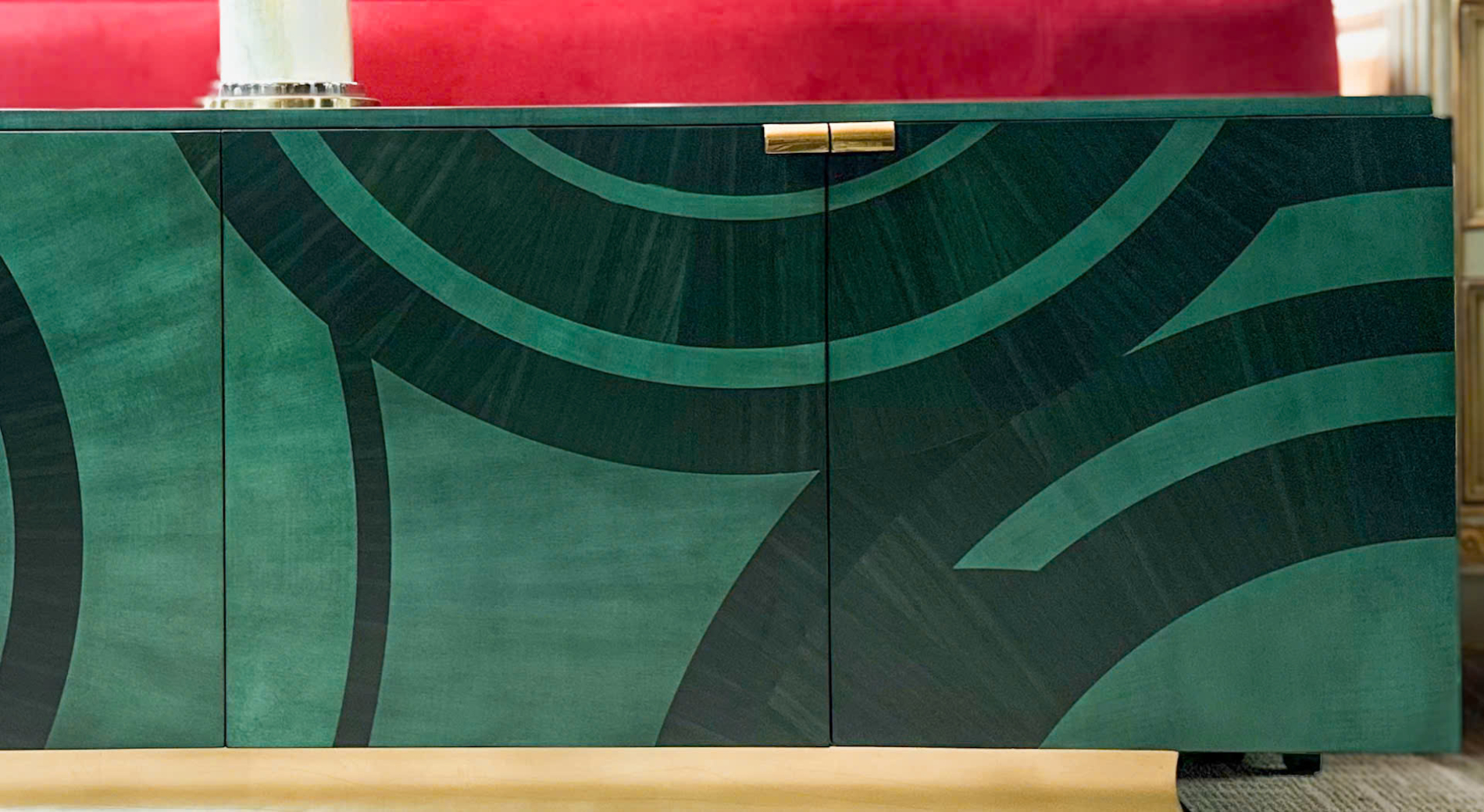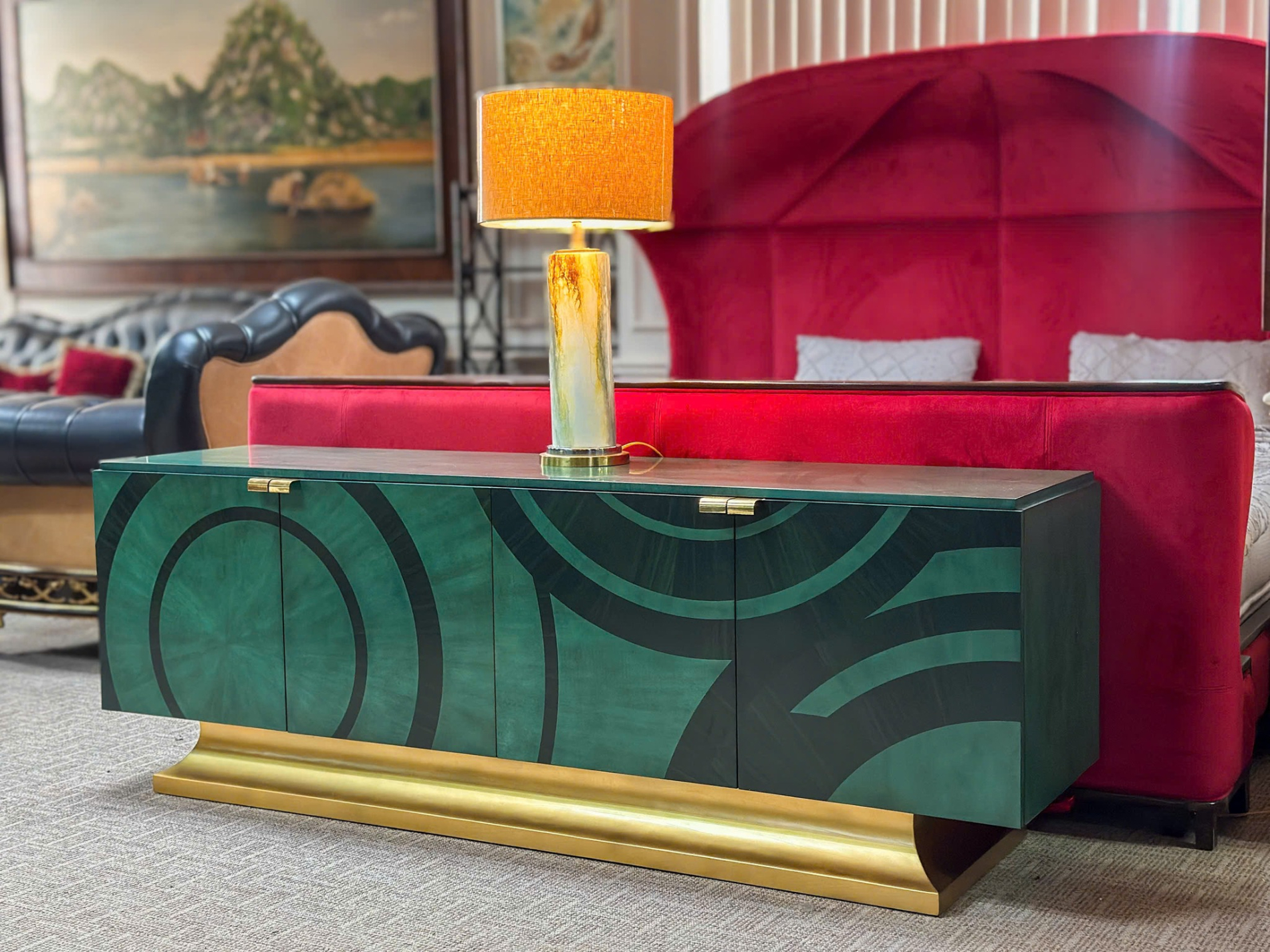 Chiếc tủ Deja Blue mang đến một cảm giác rất riêng ngay từ ánh nhìn đầu tiên. Màu xanh Peacock sâu lắng trải đều trên vân gỗ Koto, điểm xuyết những vòng tròn Art Deco gợi nhắc đến mặt hồ loang ánh sóng. Dưới chân, lớp phủ vàng ánh lên, khiến toàn bộ khối tủ như đang khẽ tỏa sáng trong không gian.