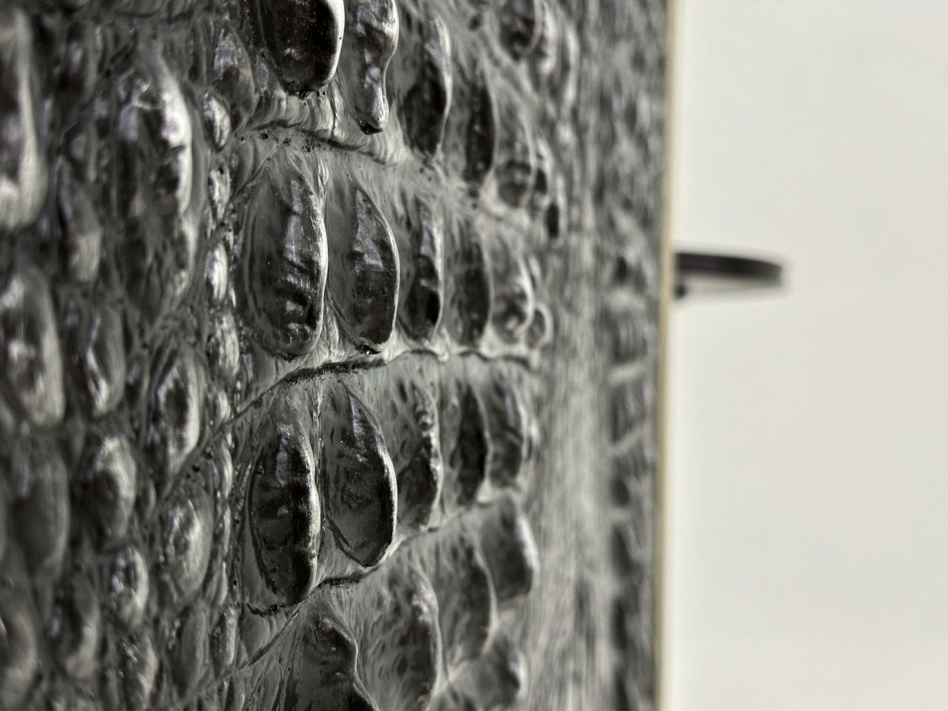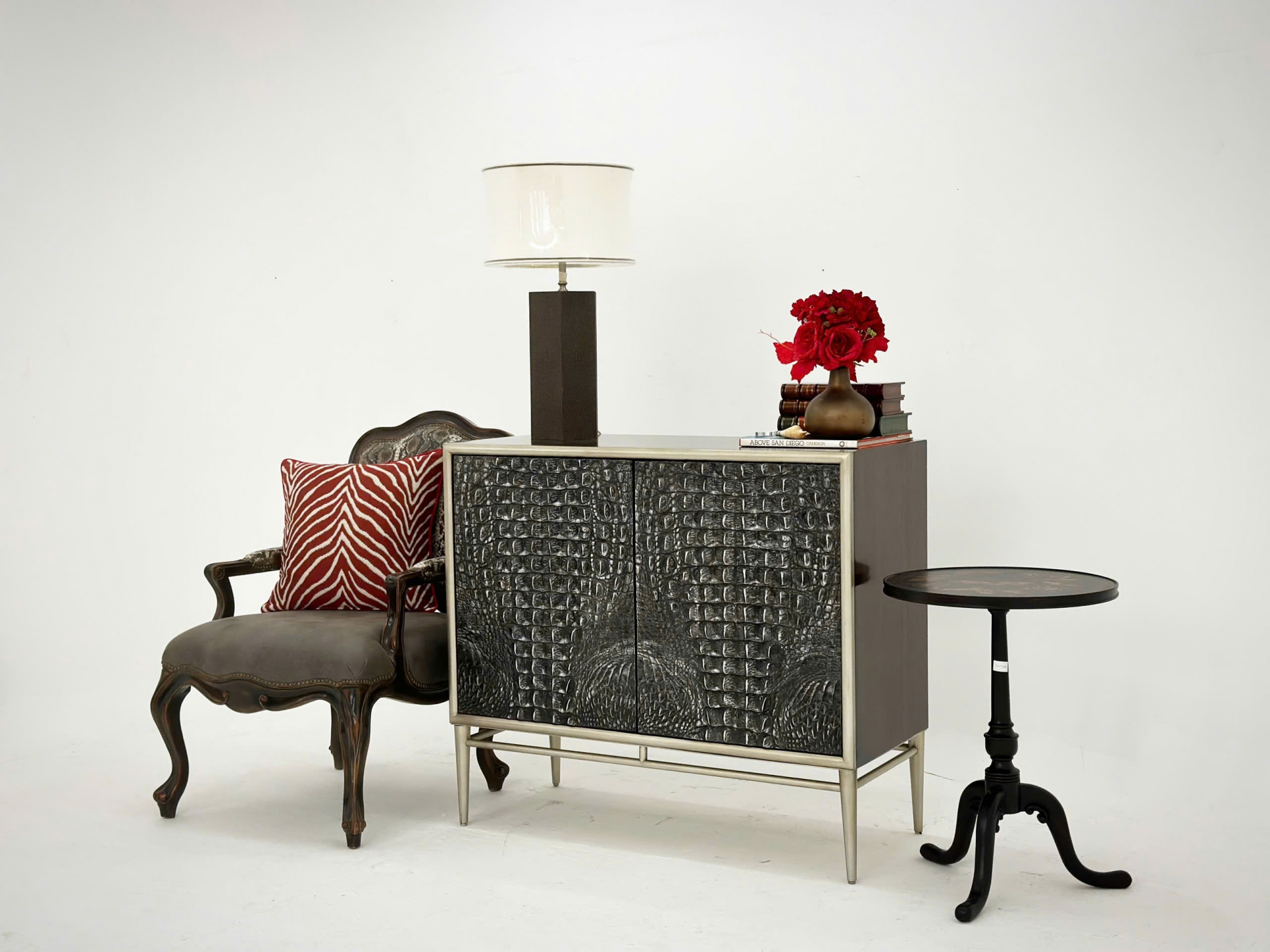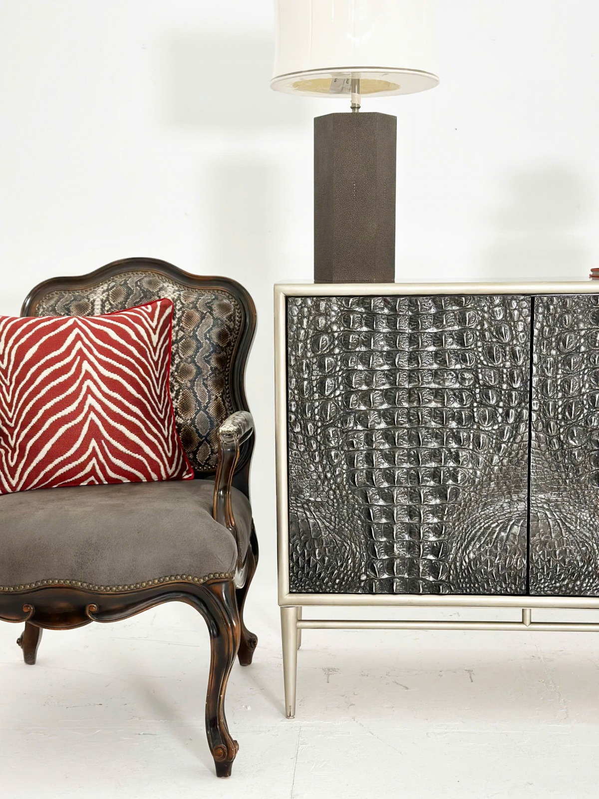 Chiếc tủ Greystoke có điểm nhấn là phần mặt cánh giả vân da cá sấu được hoàn thiện bằng màu beluga cổ với đồng thau đánh bóng và đế kim loại, tông màu xám đen nam tính mạnh mẽ.