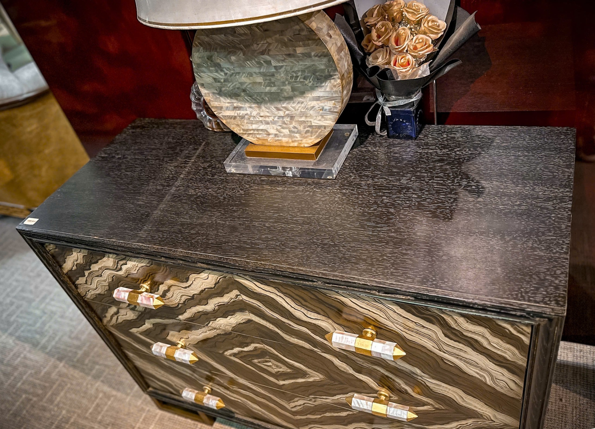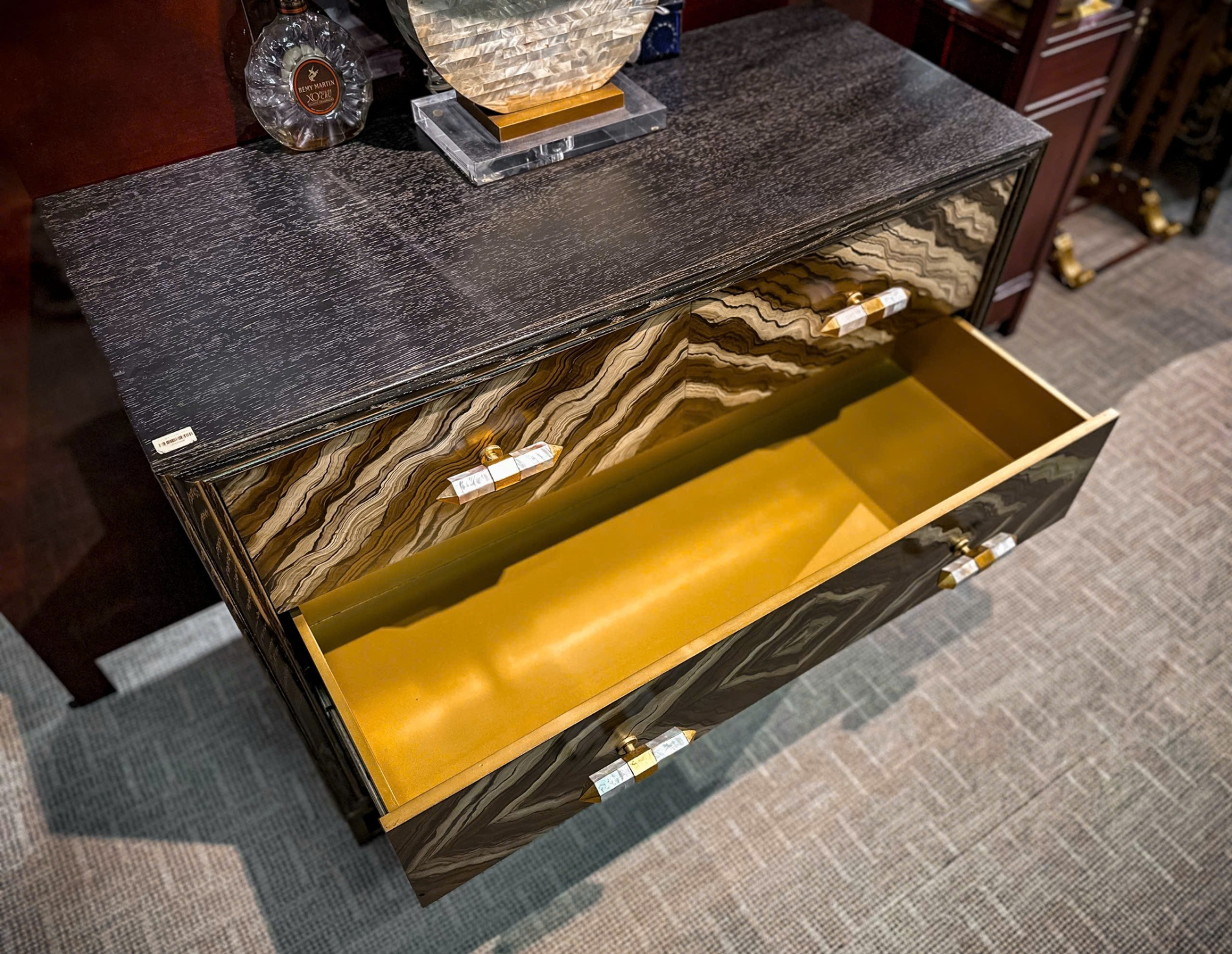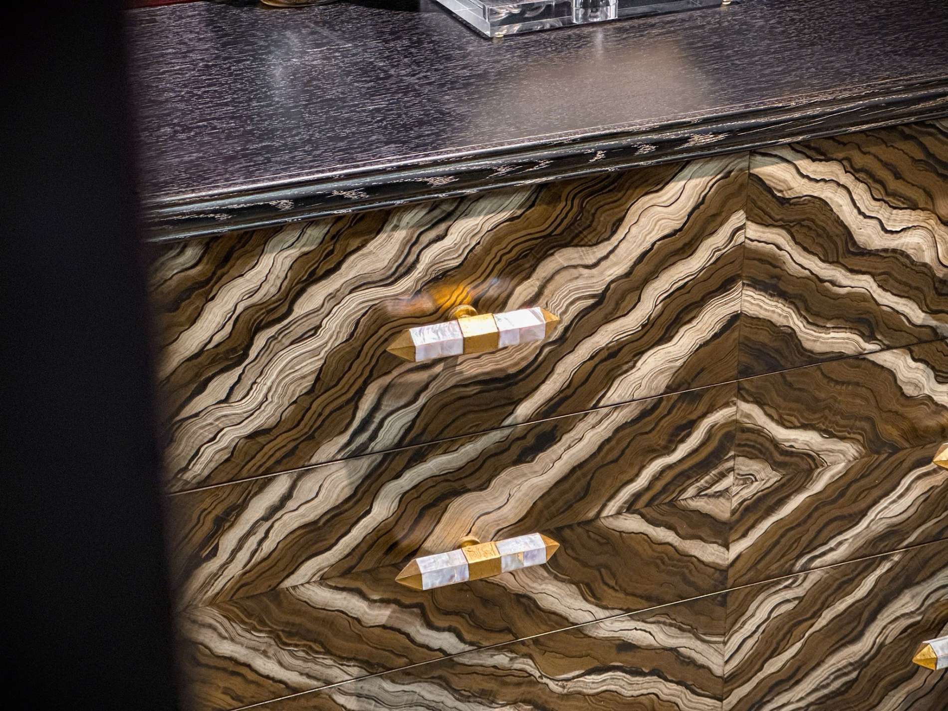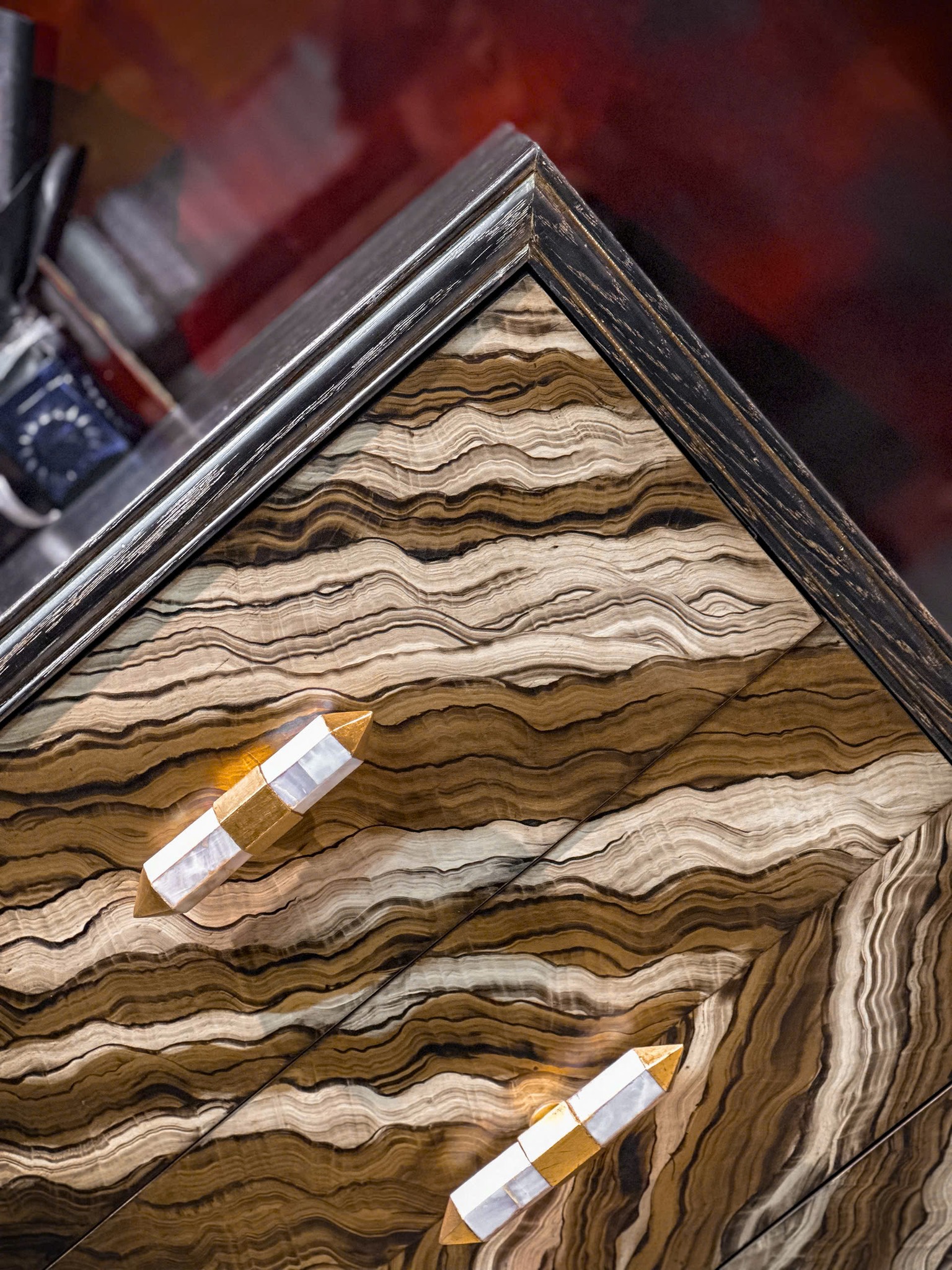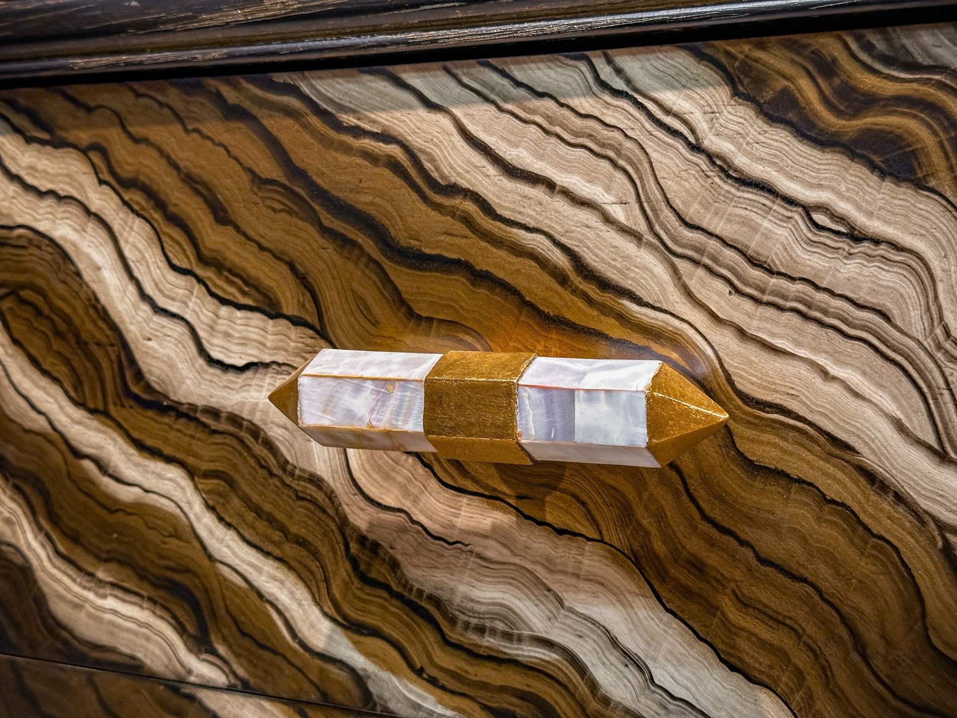 Một chiếc tủ gỗ sồi ba ngăn kéo màu xám đen với mặt trước đẹp như một tuyệt tác của tự nhiên khi được sơn thủ công họa tiết vân đá cẩm thạch đối xứng màu nâu xám và vàng, với điểm nhấn là tay cầm bằng đồng thau và xà cừ.