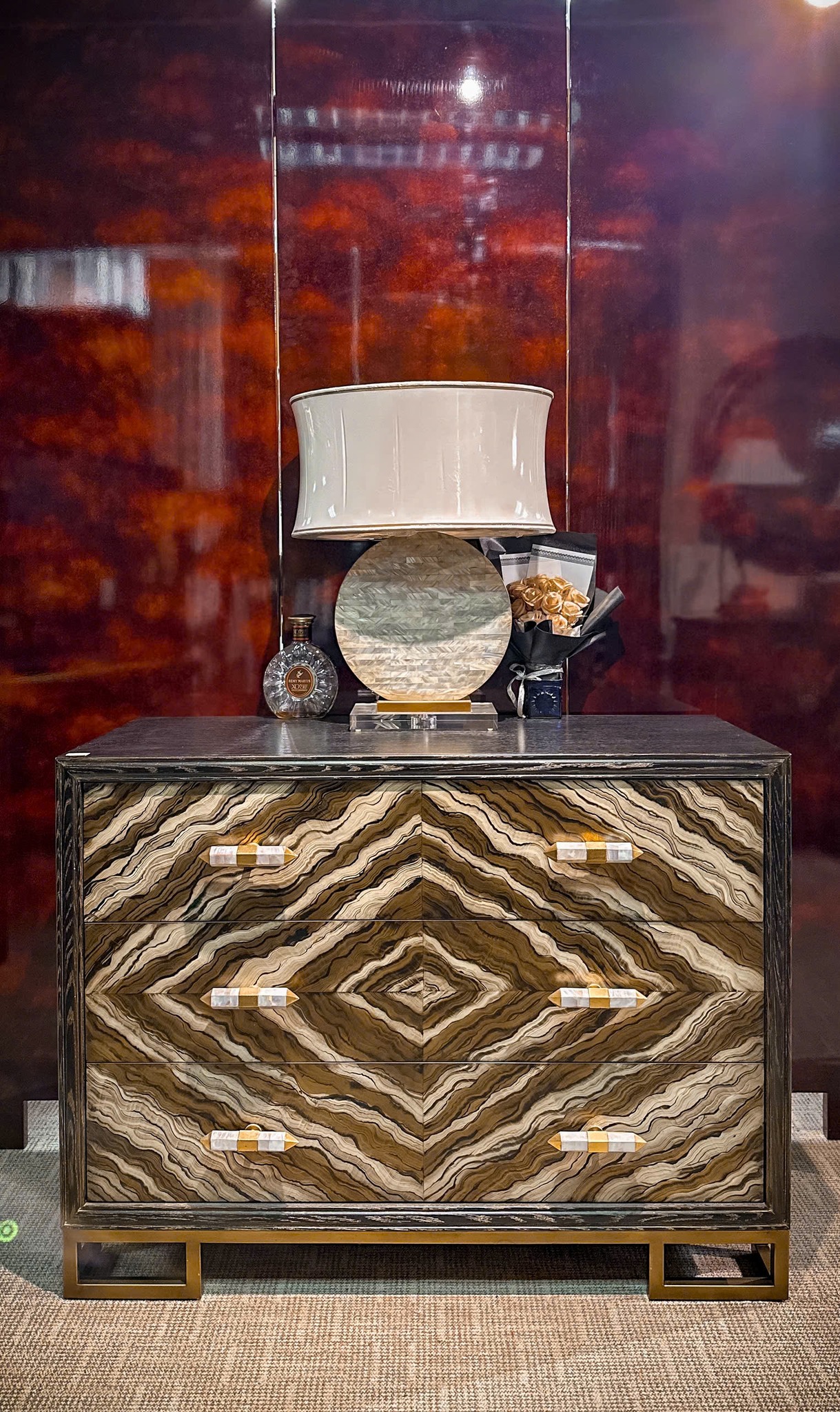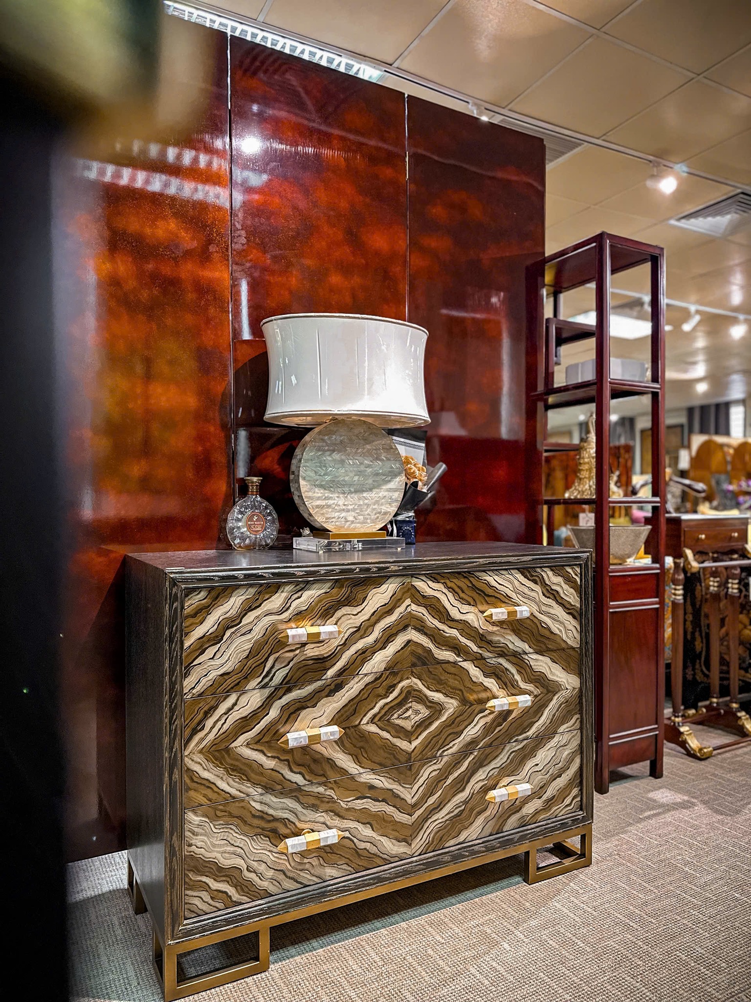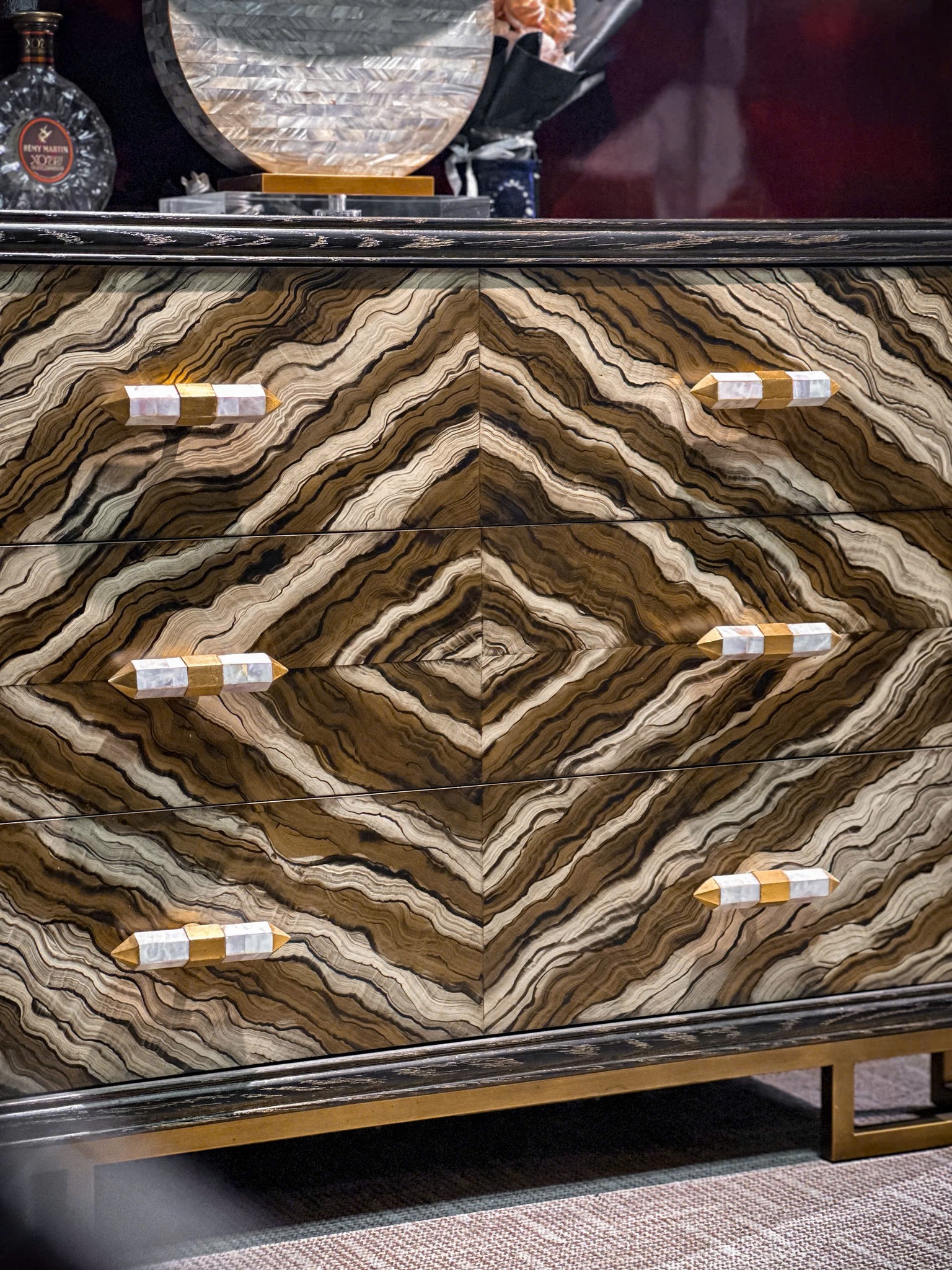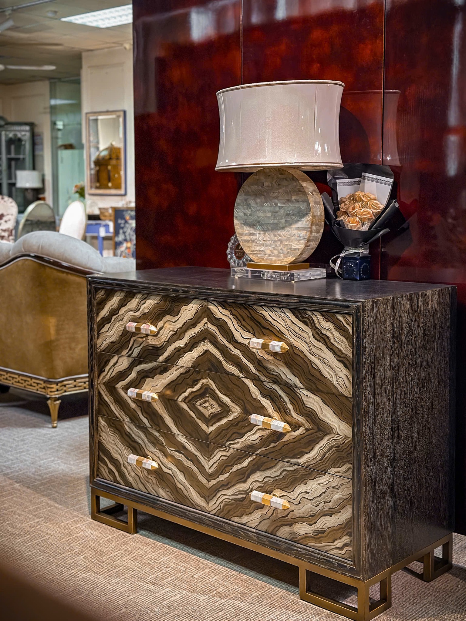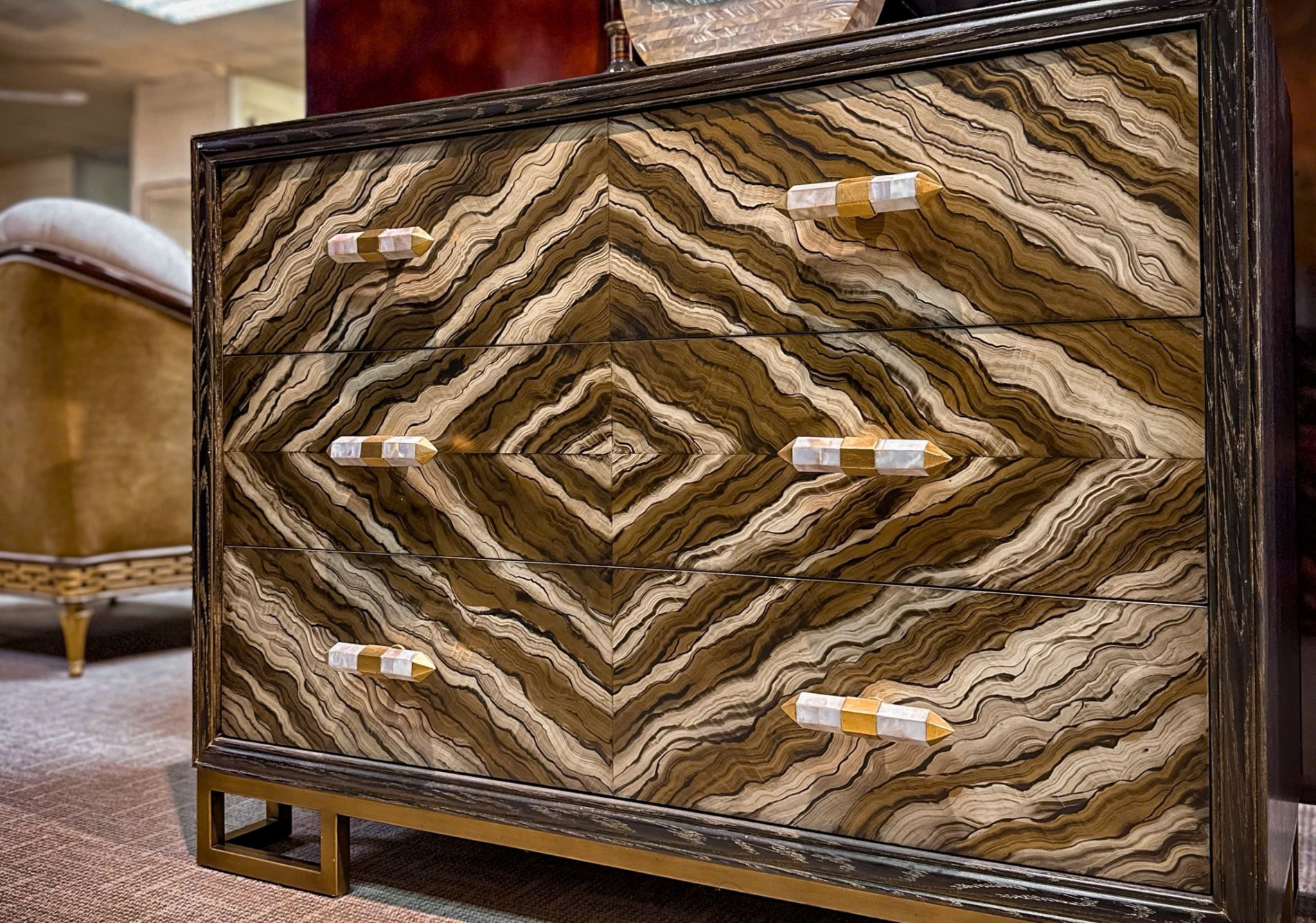 Một chiếc tủ gỗ sồi ba ngăn kéo màu xám đen với mặt trước đẹp như một tuyệt tác của tự nhiên khi được sơn thủ công họa tiết vân đá cẩm thạch đối xứng màu nâu xám và vàng, với điểm nhấn là tay cầm bằng đồng thau và xà cừ.