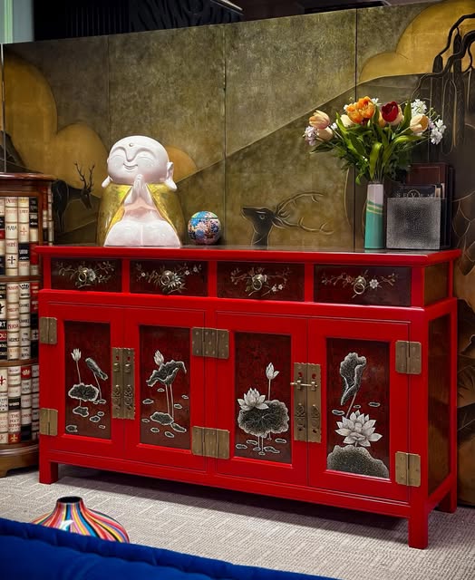 Tủ trang trí nền đỏ vẽ sen 12.24