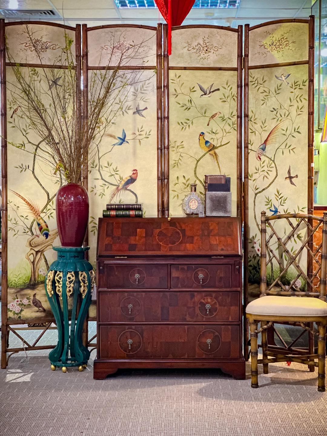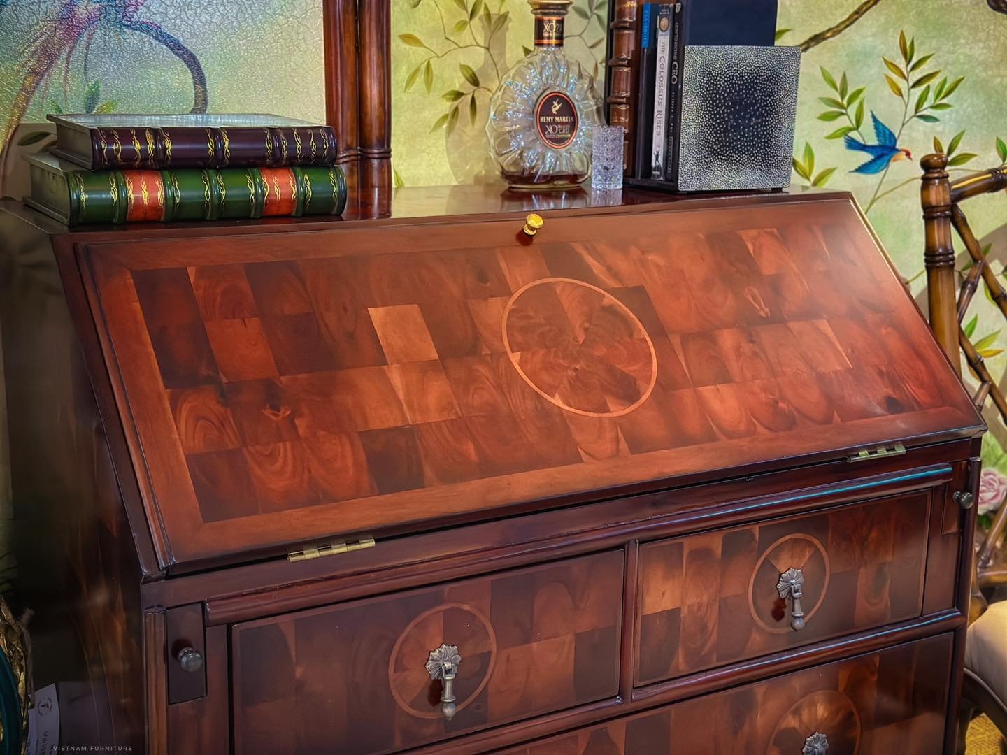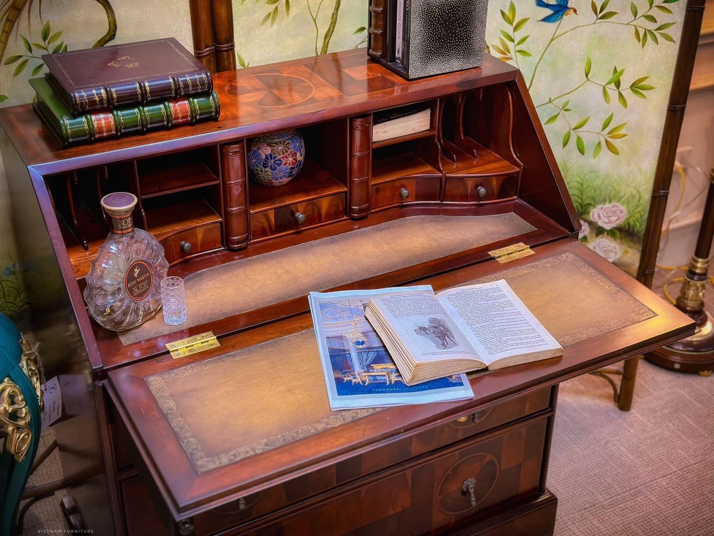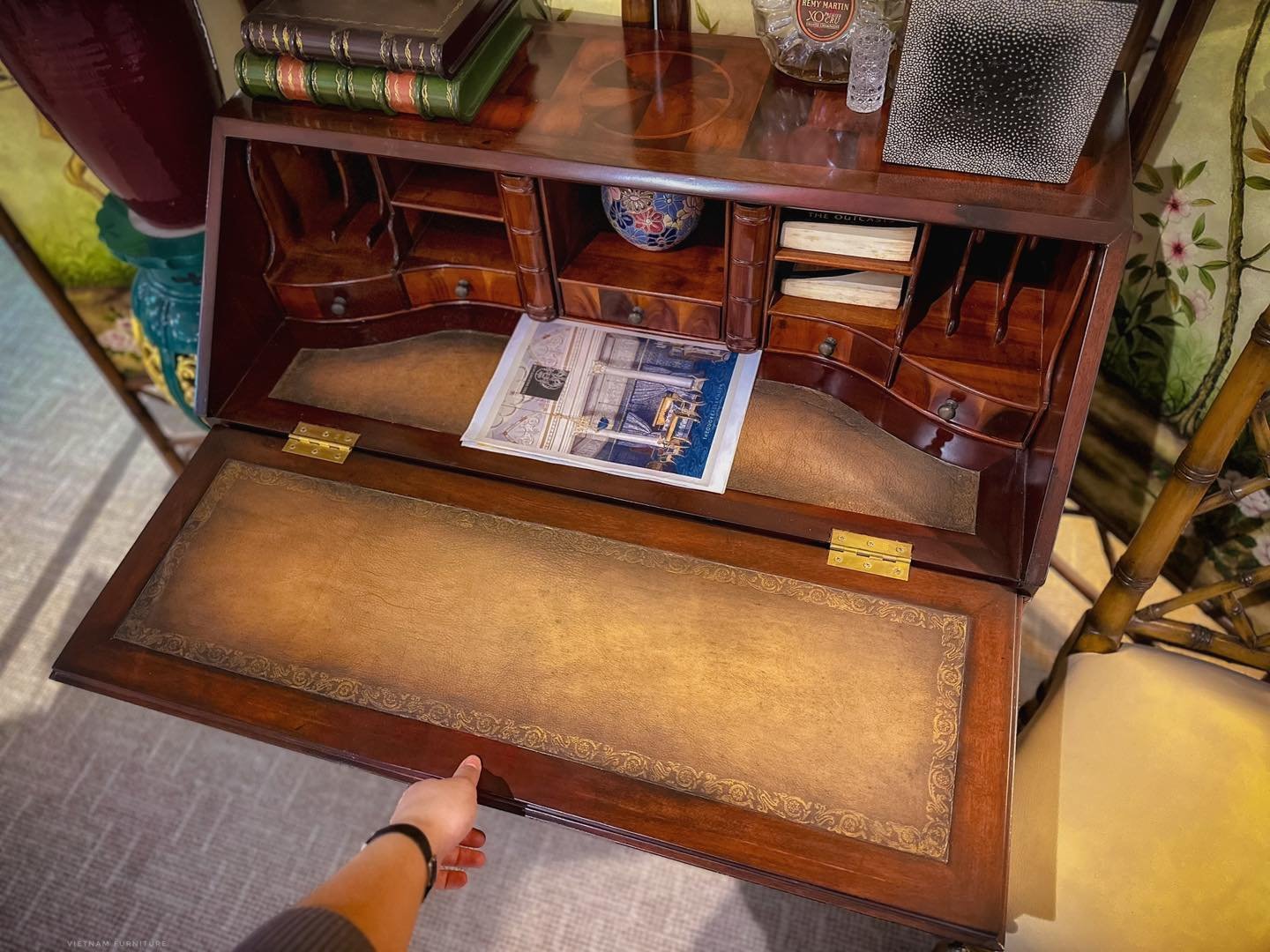 Ở trạng thái tĩnh, bàn đứng đó uy nghiêm như một chiếc tủ Commode bề thế. Những ngăn kéo vuông vức cùng tay cầm đồng giả cổ là nơi lưu giữ những phong bao lì xì đỏ thắm hay những cuốn sách quý của gia đình. Nhưng chỉ cần khẽ hạ mặt bàn, một thế giới riêng tư đầy cảm hứng sẽ hiện ra. Lớp da thật mềm mại, điểm xuyết đường viền dập chìm lá vàng sang trọng chính là nơi nâng niu từng nét bút khai xuân. Những ngăn nhỏ (pigeonholes) bên trong tựa như những "ngôi nhà" nhỏ bình yên, nơi cất giữ những bức thư tay tâm tình hay những dự định còn ấp ủ cho một năm mới đại cát.