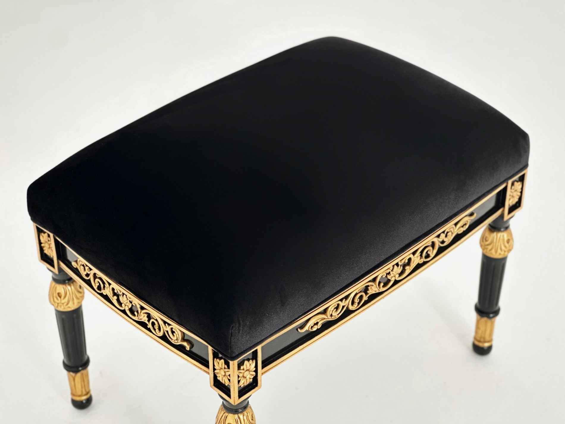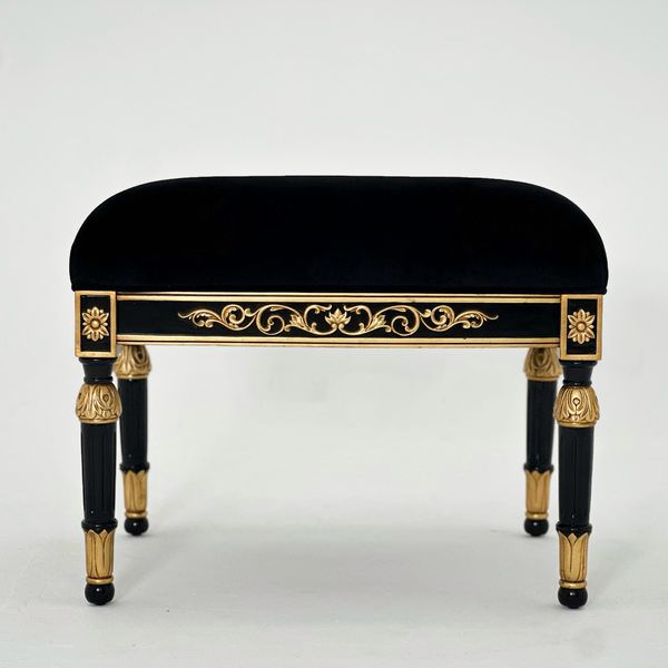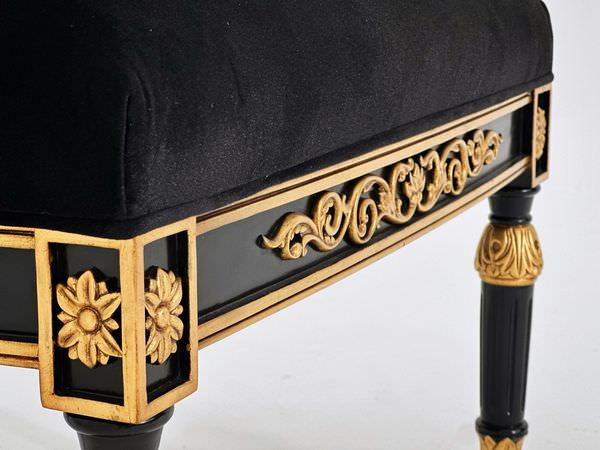 Mặt đôn vải đen tuyền huyền bí. Chân tiện sơn inchem 8 lớp chỉ để có màu đen sâu thẳm, tương phản mạnh với chi tiết hoa acanthus dát vàng giả cổ.